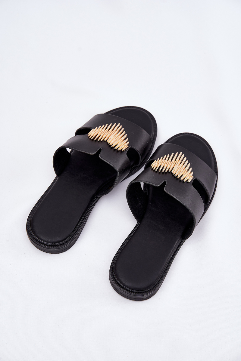 Damskie Klapki Płaski Obcas Złota Ozdoba Eko Skóra Czarne Karinma