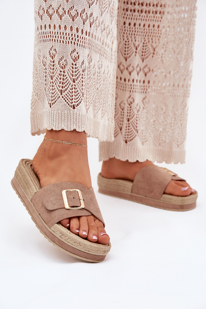 Klasyczne klapki o modnym fasonie pasują do wielu stylizacji! Idealne dla każdej kobiety ceniącej sobie komfort i wygodę na co dzień. Świetnie sprawdzą się w cieplejsze dni. Klapki na platformie z imitacją plecionki. Wykonane z eko zamszu. Z przodu regulowany pasek ze złotą klamrą. Doskonale komponują się z lekkimi sukienkami, szortami i letnimi spódnicami, tworząc idealne uzupełnienie wakacyjnych zestawów.