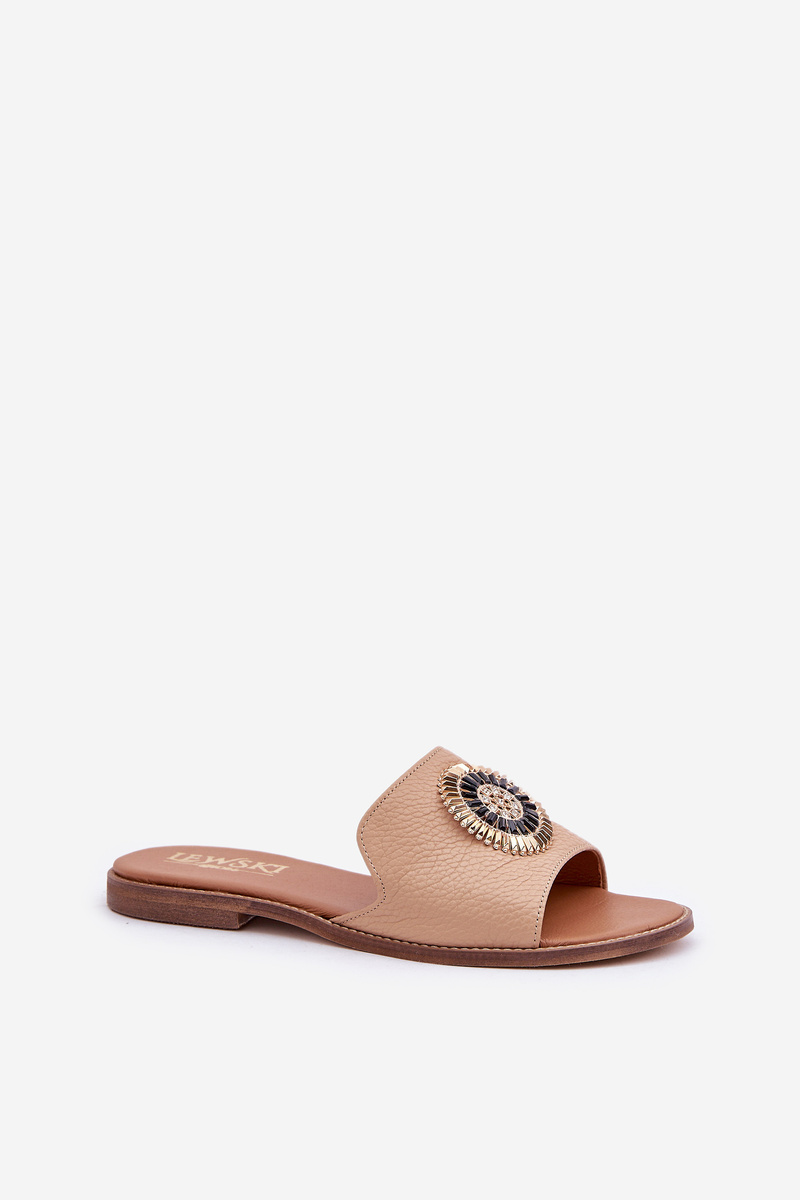 Damskie Klapki Skóra Naturalna Płaski Obcas Ozdoba Beżowe Lewski 3047/O