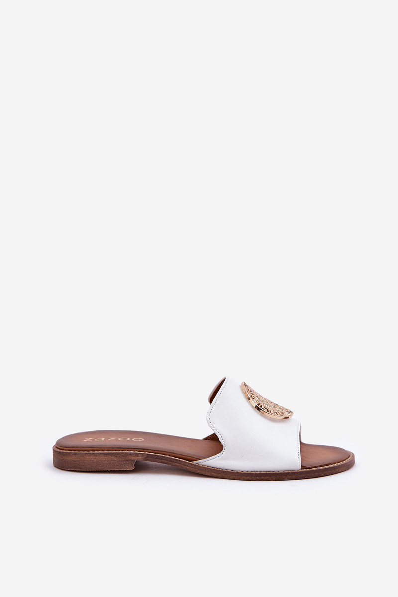 Damskie Klapki Skóra Naturalna Płaski Obcas Ozdoba Białe 3047/O