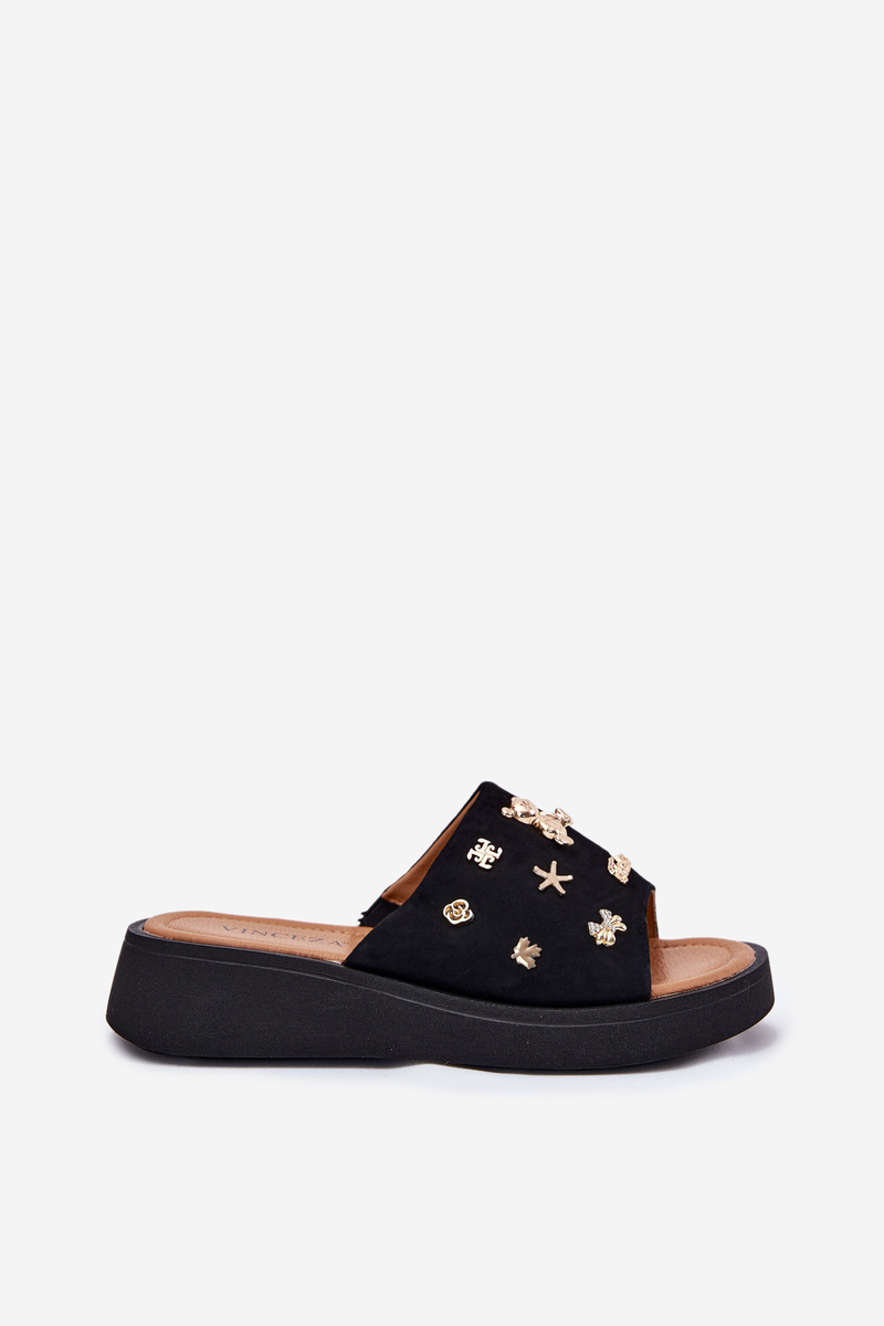 Klasyczne klapki o modnym fasonie pasują do wielu stylizacji! Idealne dla każdej kobiety ceniącej sobie komfort i wygodę na co dzień. Świetnie sprawdzą się w cieplejsze dni. Klapki od marki Vinceza. Wykonane z naturalnego zamszu. Osadzone na platformie. Model ten wyróżnia się przypinkami na pasku, które nadają wyjątkowego uroku. Wkładka skórzana.