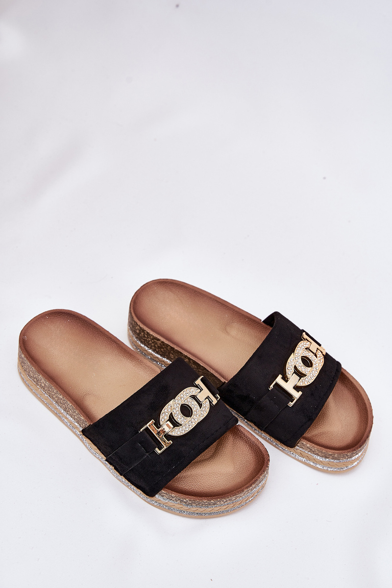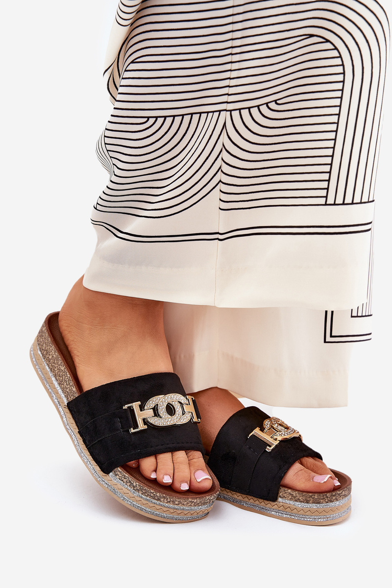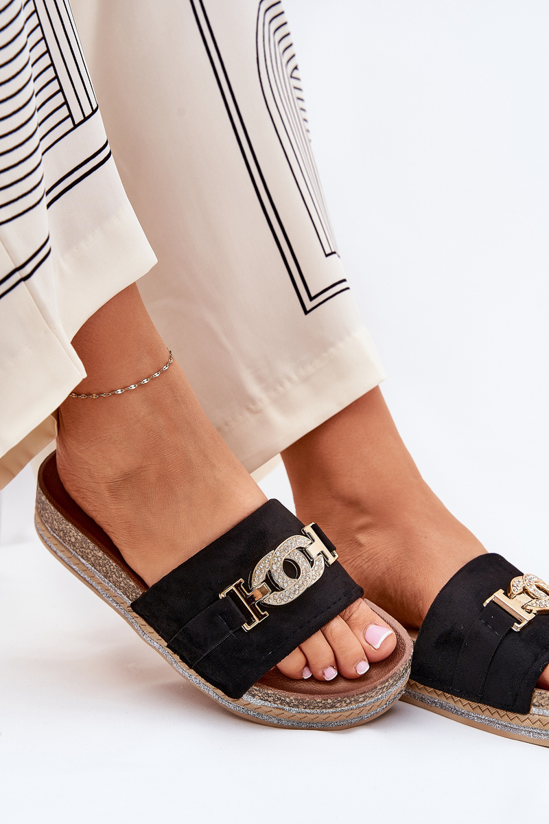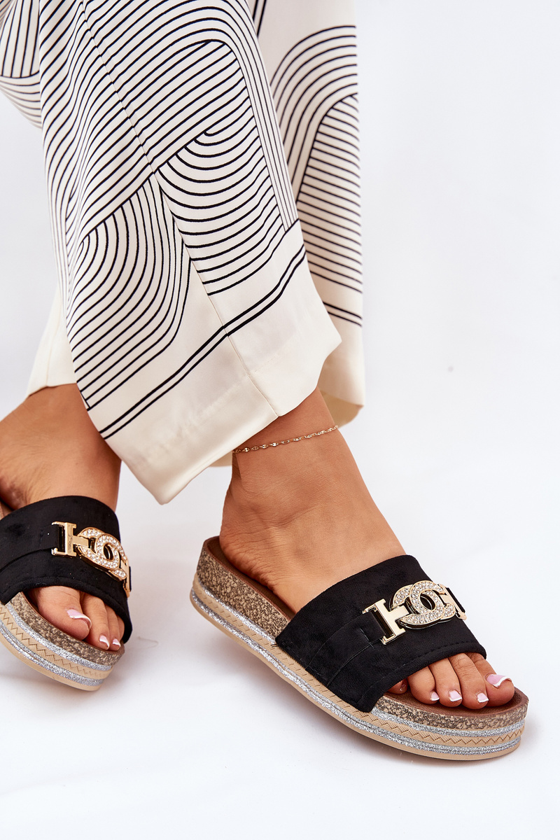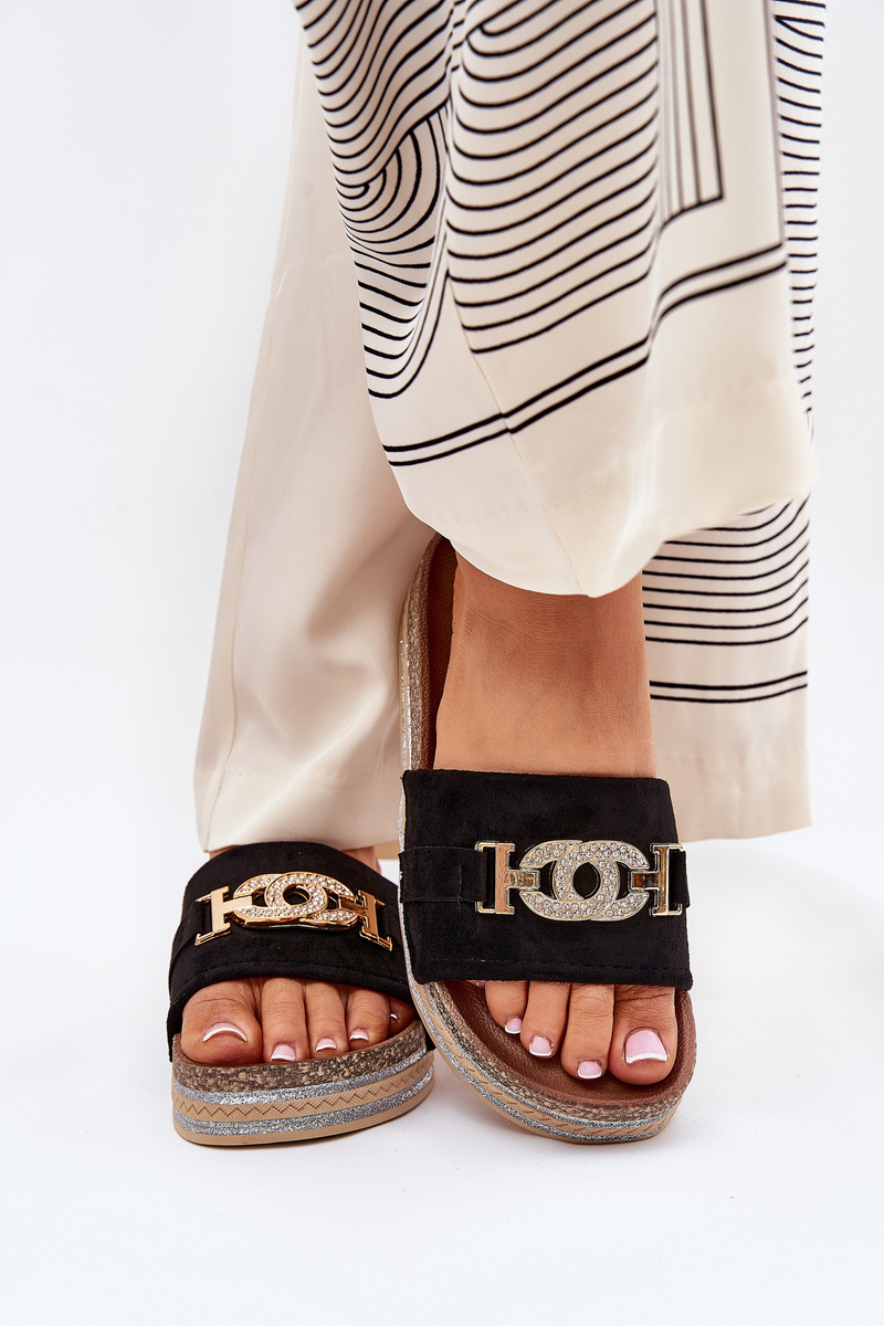 Damskie Klapki Ze Złotą Ozdobą Na Platformie Czarne Eanes