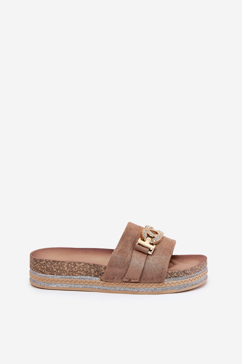 Klasyczne klapki o modnym fasonie pasują do wielu stylizacji! Idealne dla każdej kobiety ceniącej sobie komfort i wygodę na co dzień. Idealne na cieplejsze dni. Wykonane z eko zamszu. Osadzone na platformie, która ozdobiona jest brokatem. Złoty detal z przodu nadaje wyjątkowego charakteru. Stylowy fason, doskonały na co dzień.
