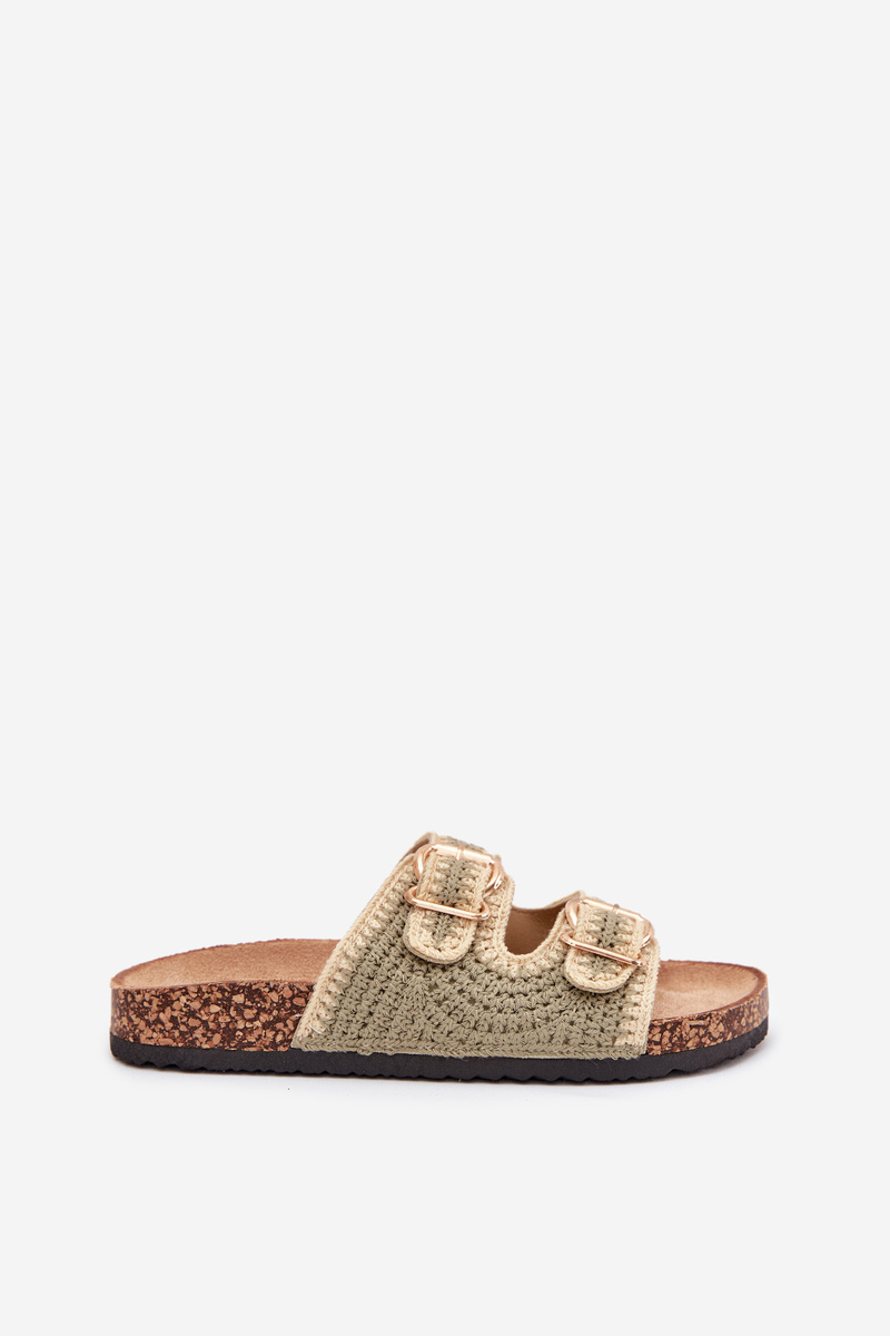 Klasyczne klapki o modnym fasonie pasują do wielu stylizacji! Idealne dla każdej kobiety ceniącej sobie komfort i wygodę na co dzień. Idealne na cieplejsze dni. Szydełkowe klapki osadzone na korkowej platformie. Wkładka profilowana, eko zamszowa. Dwie złote klamry. Stylowy fason, doskonały do casualowych stylizacji.