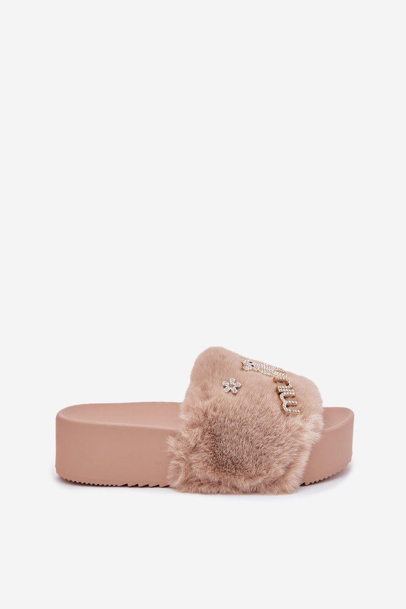 Klasyczne klapki o modnym fasonie pasują do wielu stylizacji! Idealne dla każdej kobiety ceniącej sobie komfort i wygodę na co dzień. Idealne na cieplejsze dni. Klapki z futerkiem na masywnej platformie, które dodaje wysokości. Złote przypinki stanowią elegancki detal, podkreślając ich unikalny charakter. Doskonałe do codziennych, swobodnych stylizacji.