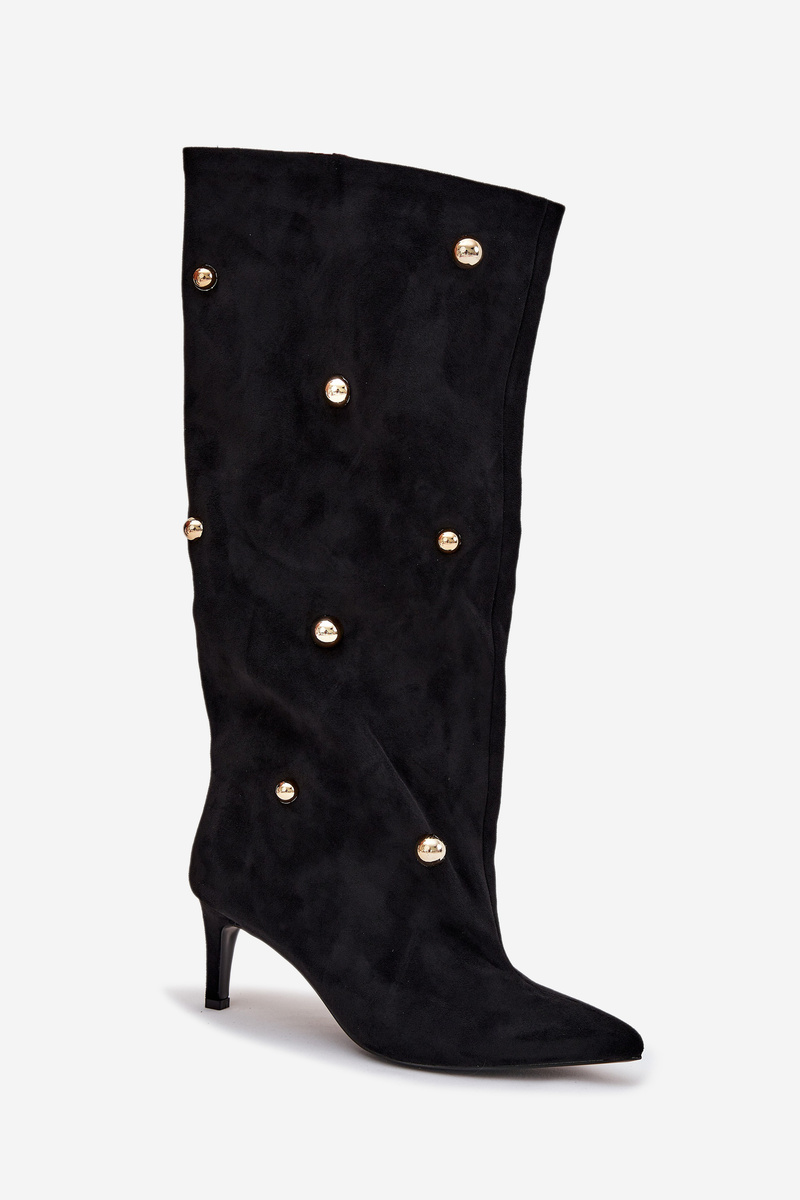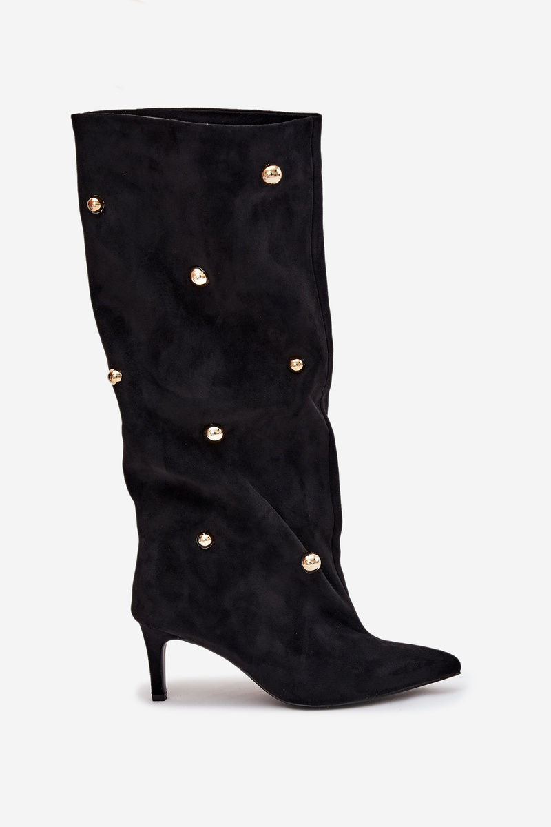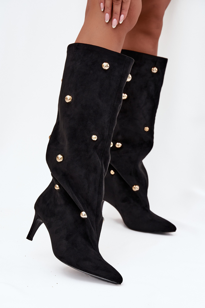 Kozaki na obcasie świetnie sprawdzą się w wielu stylizacjach. Wyjątkowy fason zachwyci każdego! Kozaki są stabilne oraz wygodne w użytkowaniu. Musisz je mieć w swojej szafie ! Wykonane z miękkiego eko zamszu. Osadzone na obcasie w formie szpilki. Model wsuwany. Noski w szpic. Złote ozdoby na cholewce wprowadzają stylowy akcent. Doskonałe do sukienek i spódnic.