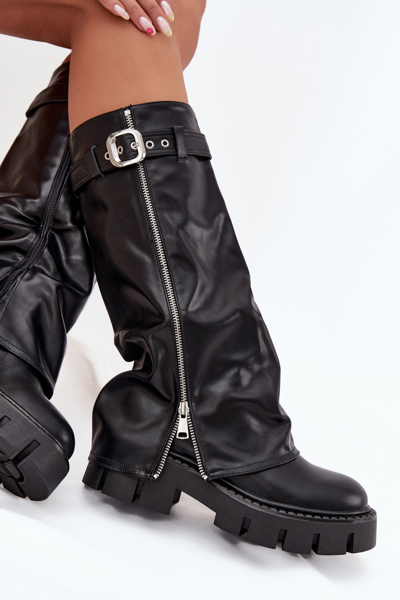 Damskie Kozaki Ocieplane Wywinięta Cholewka Klamra Srebrny Zamek Czarne Armena
