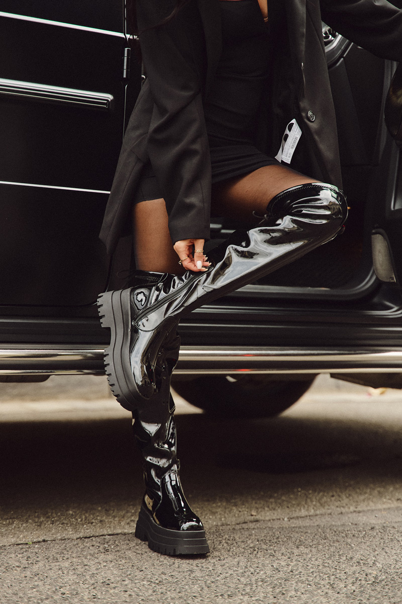Damskie Kozaki Za Kolano Lakierowane Masywna Platforma Czarne Ravela
