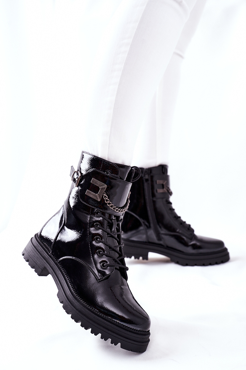 Workery to nieodłączny element jesienno-zimowych stylizacji. Botki wykonane z lakierowanej skóry ekologicznej, która wpisze się w każdy trend mody. Zakładanie ułatwi wszyty na boku suwak, natomiast dobre dopasowanie zapewni klasyczne sznurowanie. Wnętrze ocieplone ciepłym i miłym w dotyku futerkiem. Przy wyborze rozmiaru prosimy sugerować się tabelą rozmiarów.
