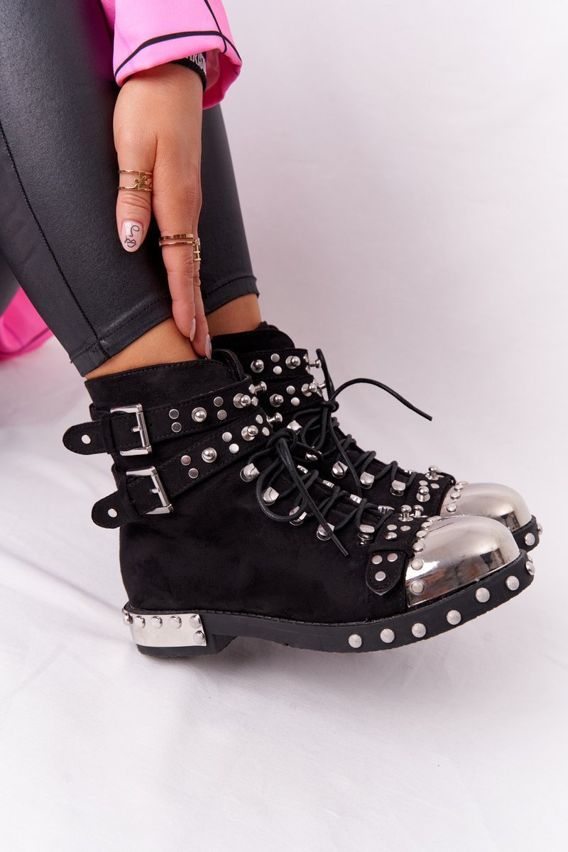 Damskie Ocieplane Botki Workery Z Dżetami Zamszowe Czarne Lu Boo