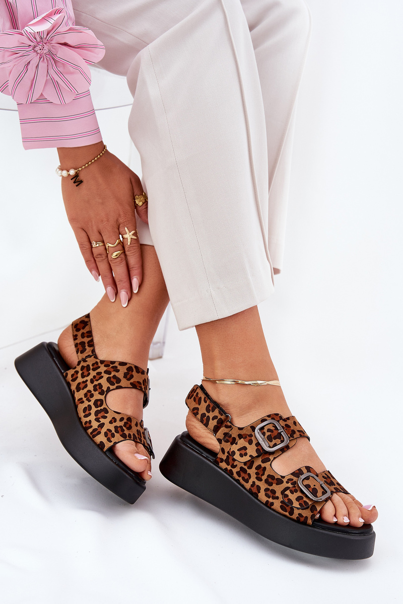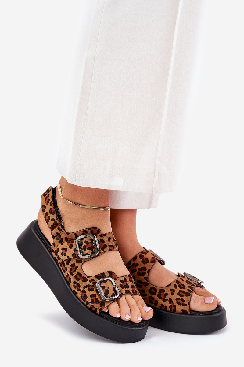 Damskie Sandały Z Klamrami Na Platformie I Koturnie Panterka Brązowe Genorre