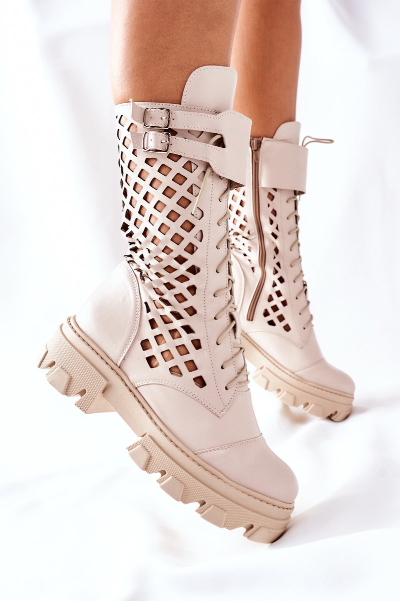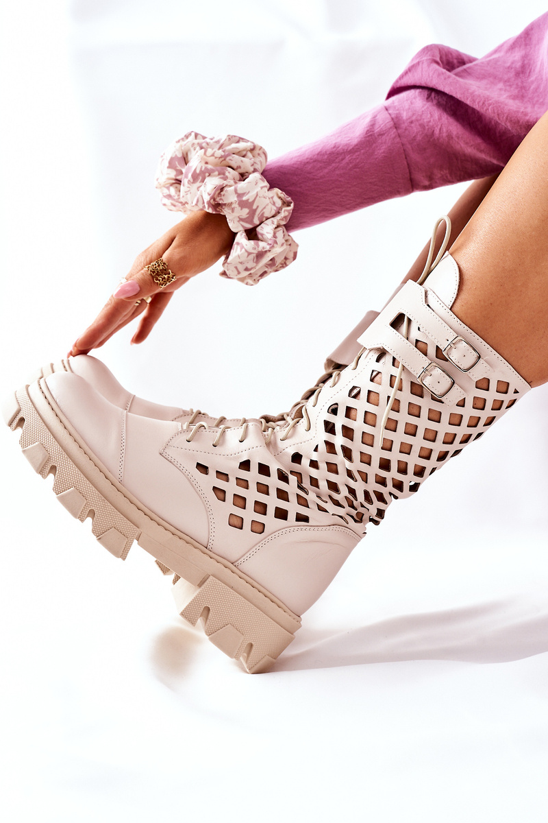 Damskie Skórzane Ażurowe Botki Trapery Beżowe Hootie