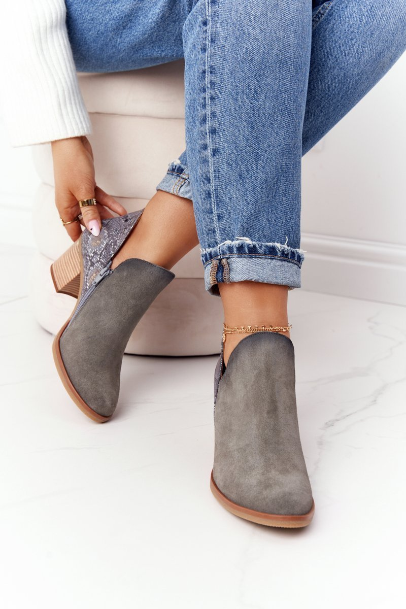 Damskie Skórzane Botki Na Słupku Maciejka Popielate 04492