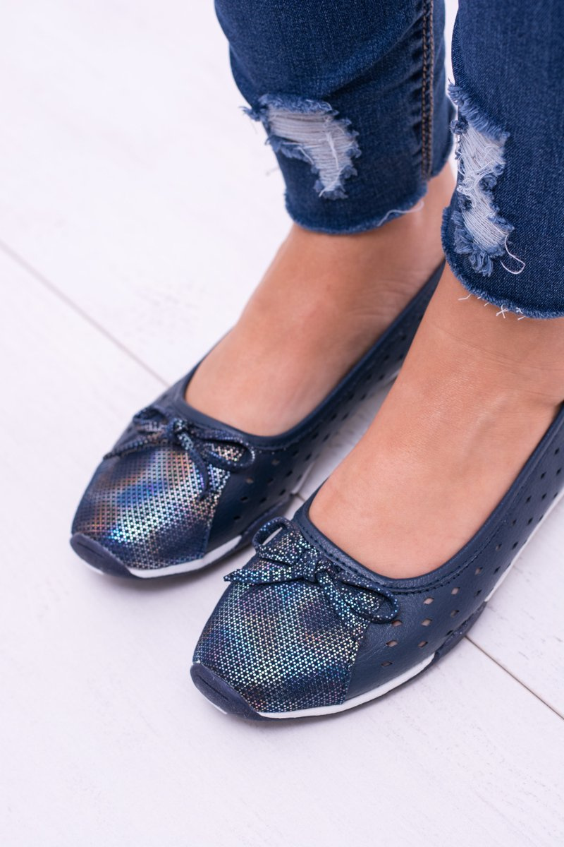 Damskie Skórzane Granatowe Ażurowe Balerinki Erdola
