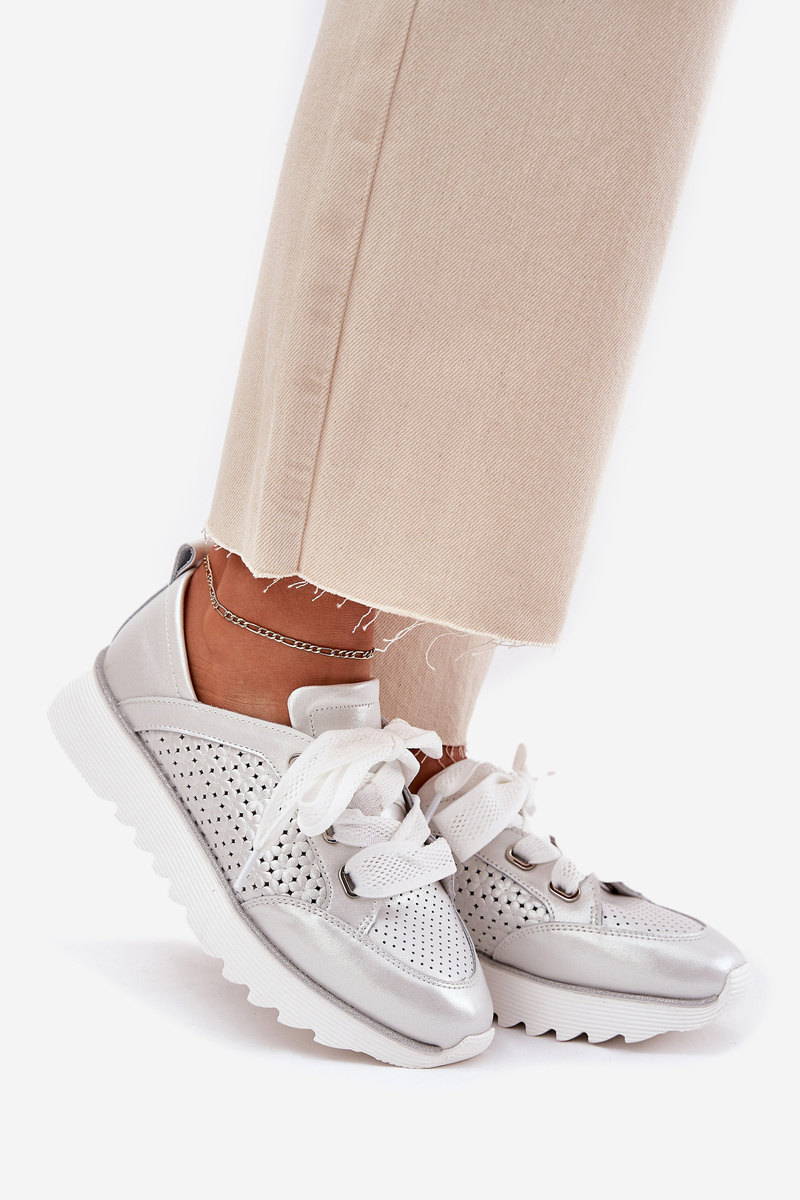 Damskie Sneakersy Skóra Naturalna Platforma Srebrne D&A LR51-796