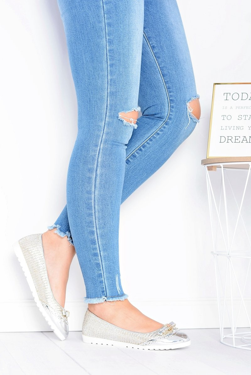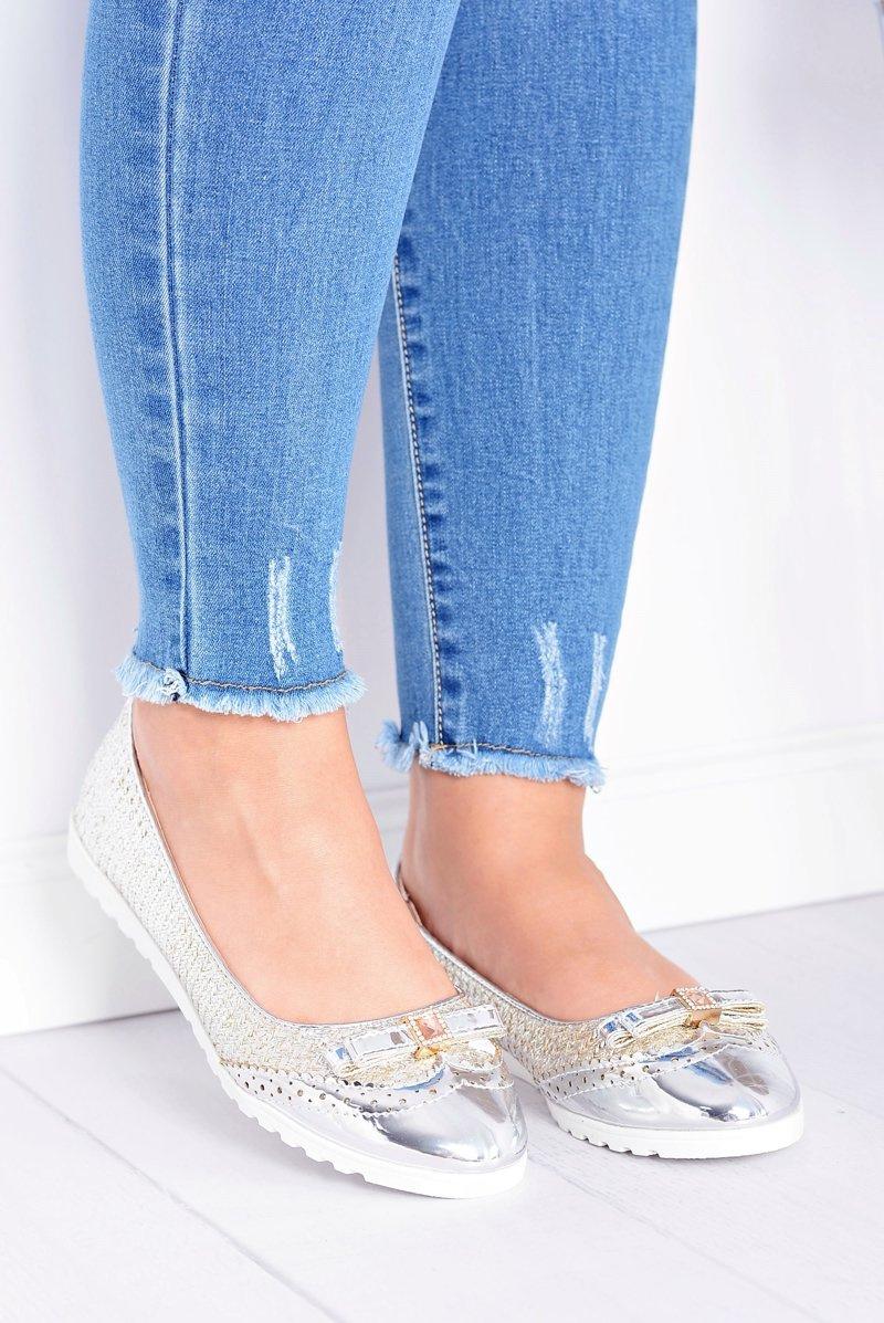 Damskie Srebrne Wsuwane Balerinki Z Kokardką Cleoss