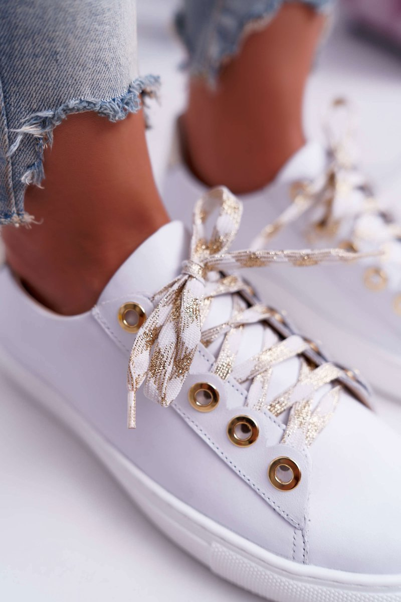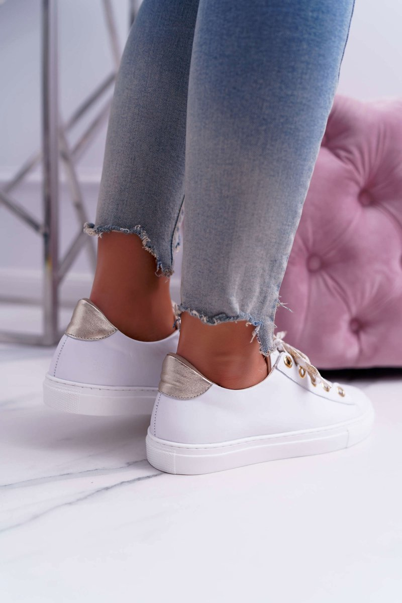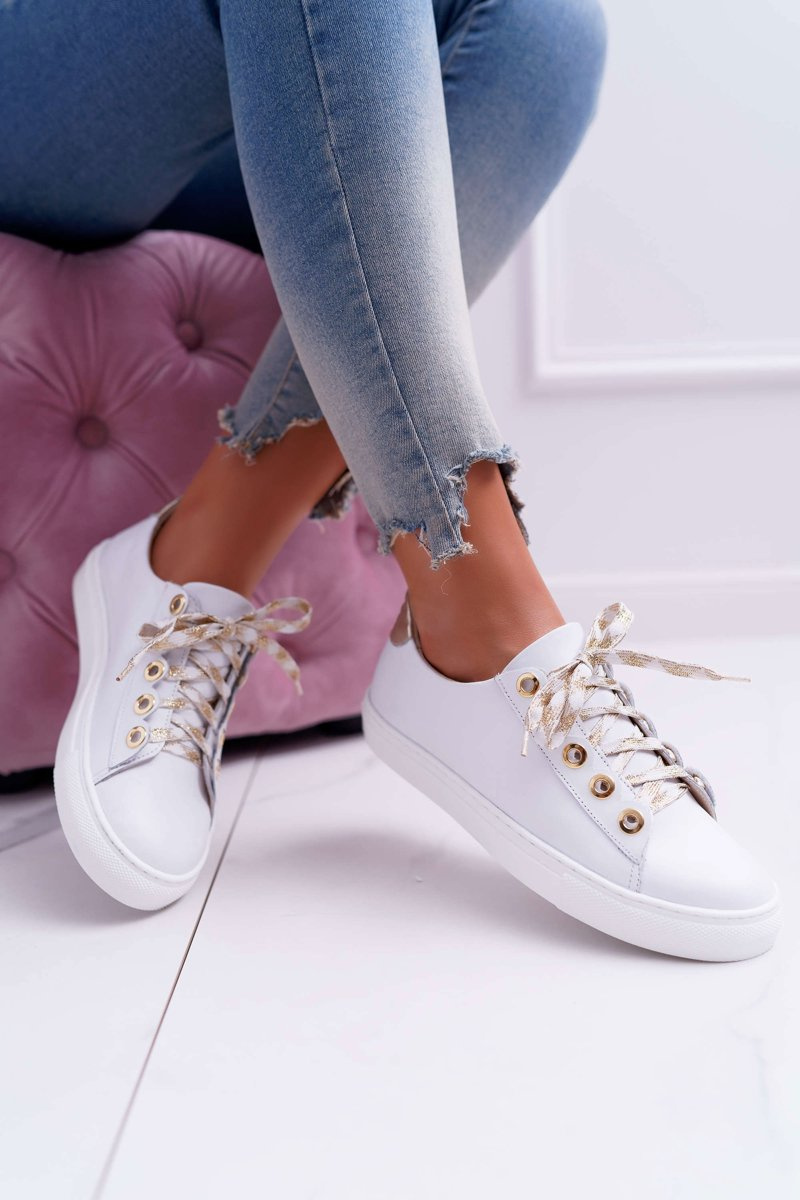 Wspaniałe damskie trampki, które świetnie wpasują się w każdą stylizację. Wierzch wykonany ze skóry naturalnej, zdobiony złotymi oczkami. Wkładka to również skóra naturalna, która zapewni nam komfort. Klasyczny wzór w eleganckiej skórzanej wersji. Przy wyborze rozmiaru prosimy sugerować się tabelą rozmiarów dostępną po najechaniu bądź kliknięciu na dany rozmiar.