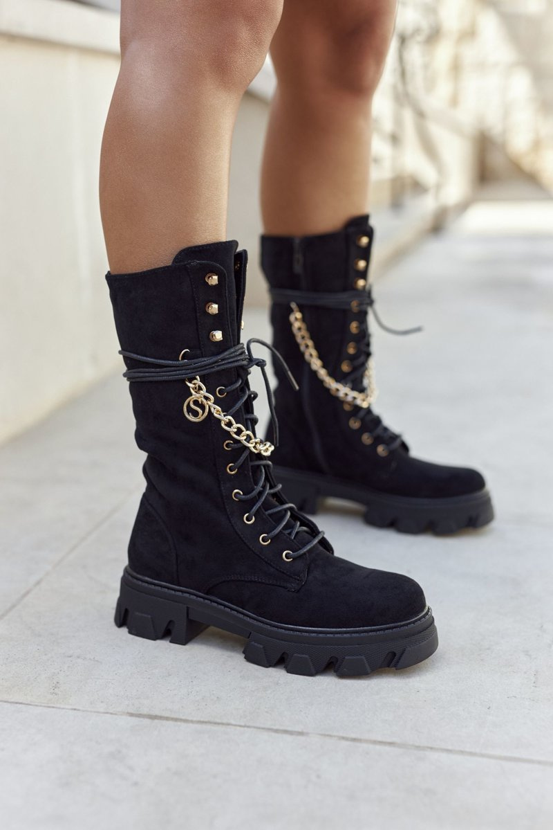 Wspaniałe botki, które mogą być Twoje! Wysoka cholewka, ocieplone wewnątrz kocem obuwniczym, to gwarancja komfortu nawet w najchłodniejsze dni. Zakładanie ułatwi wszyty na boku suwak, a idealne dopasowanie zapewni solidne sznurowanie. Piękne zdobienie w postaci złotego łańcuszka. Gruba, antypoślizgowa podeszwa to dodatkowa ochrona. Przy wyborze rozmiaru prosimy sugerować się tabelą rozmiarów.