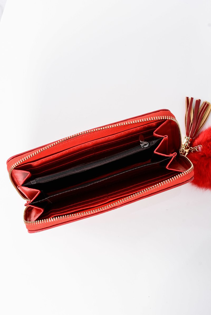Duży Damski Czerwony Portfel Złoty Zamek Brelok Futerko