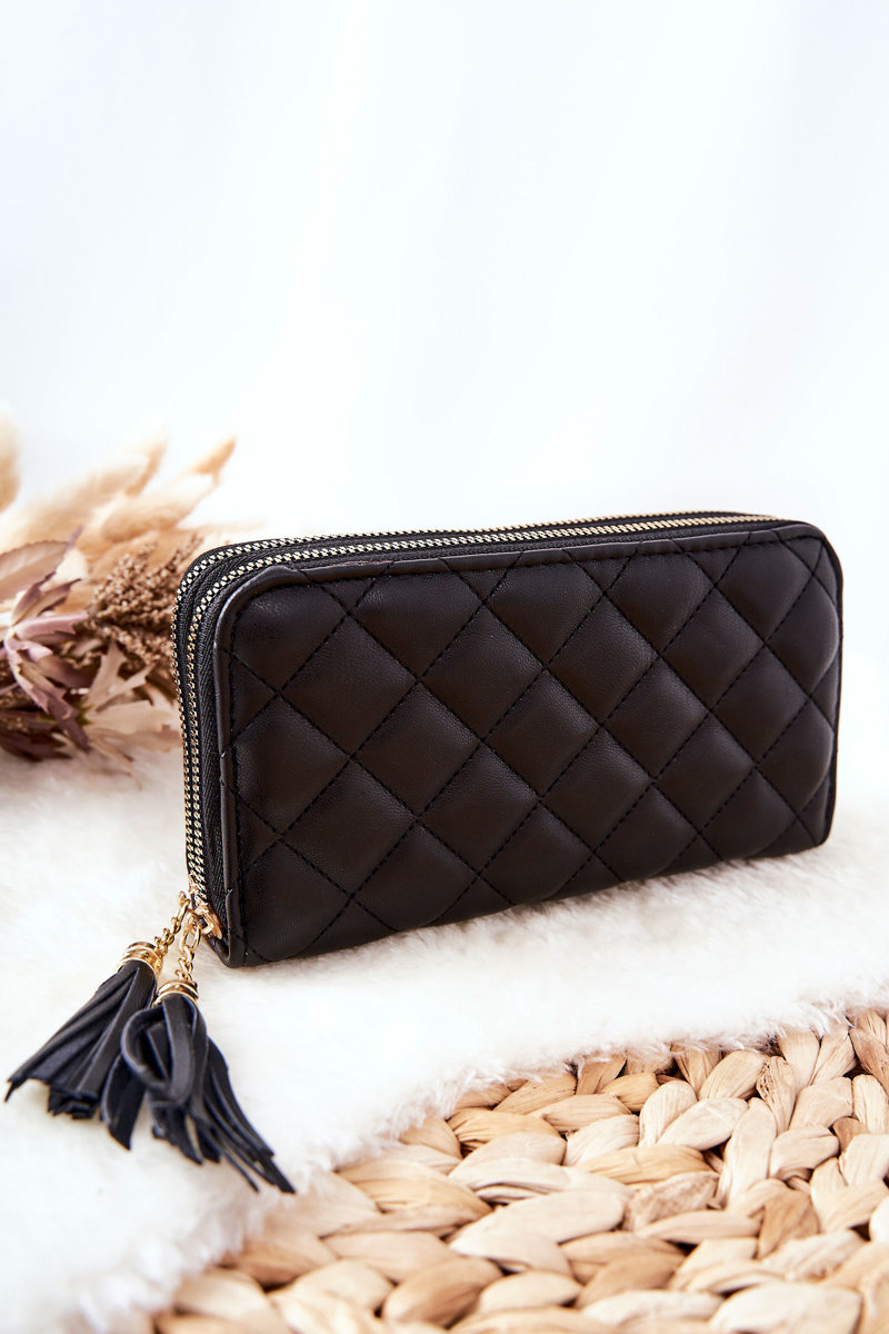 Duży i praktyczny portfel zapinany z zewnątrz na dwa zamki błyskawiczne. W jednej z przegródek można znaleźć miejsce na bilony, banknoty oraz wizytówki, natomiast w drugiej można umieścić niewielkiego smartfona lub banknoty czy dokumenty. Z zewnątrz portfel został wykonany z pikowanej eko skóry, a przy zamkach znajdują się frędzelki. Dodatkowo w zestawie jest dołączony paseczek.