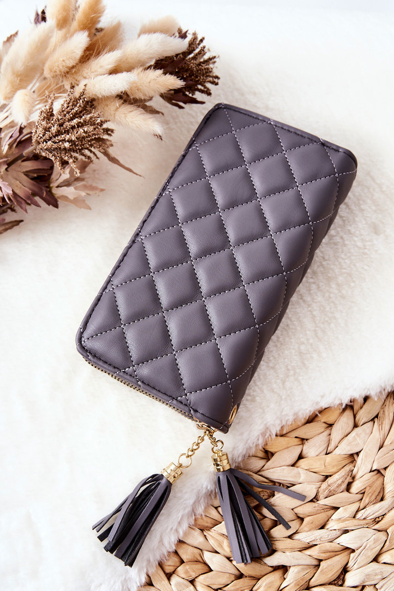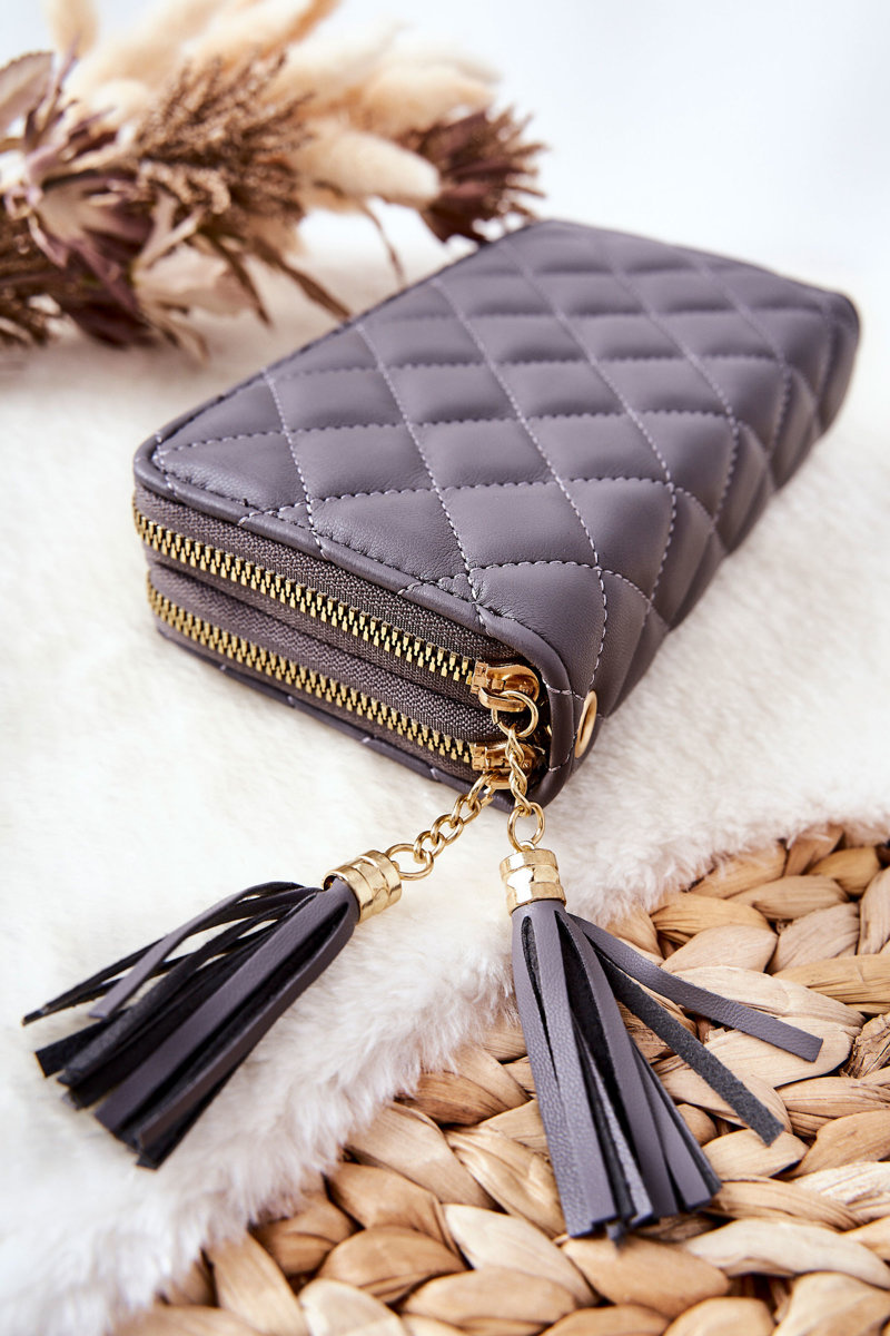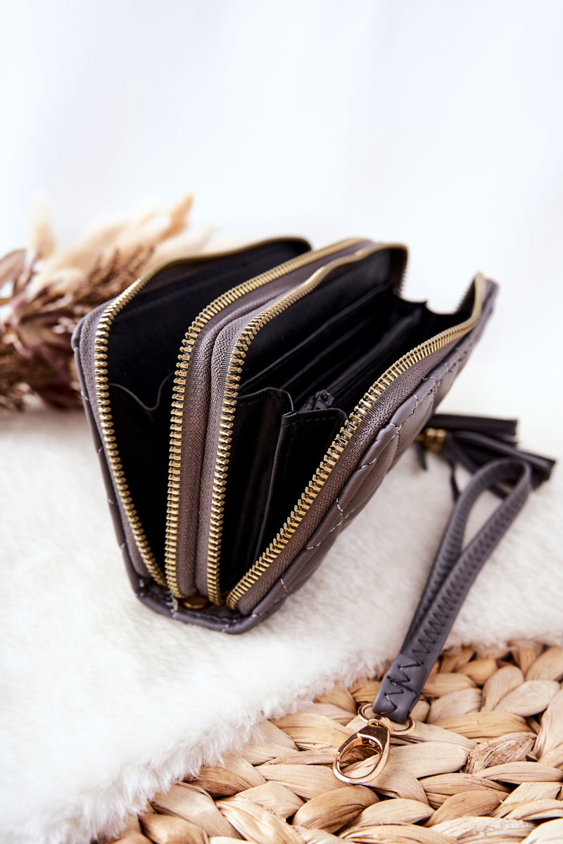 Duży i praktyczny portfel zapinany z zewnątrz na dwa zamki błyskawiczne. W jednej z przegródek można znaleźć miejsce na bilony, banknoty oraz wizytówki, natomiast w drugiej można umieścić niewielkiego smartfona lub banknoty czy dokumenty. Z zewnątrz portfel został wykonany z pikowanej eko skóry, a przy zamkach znajdują się frędzelki. Dodatkowo w zestawie jest dołączony paseczek.