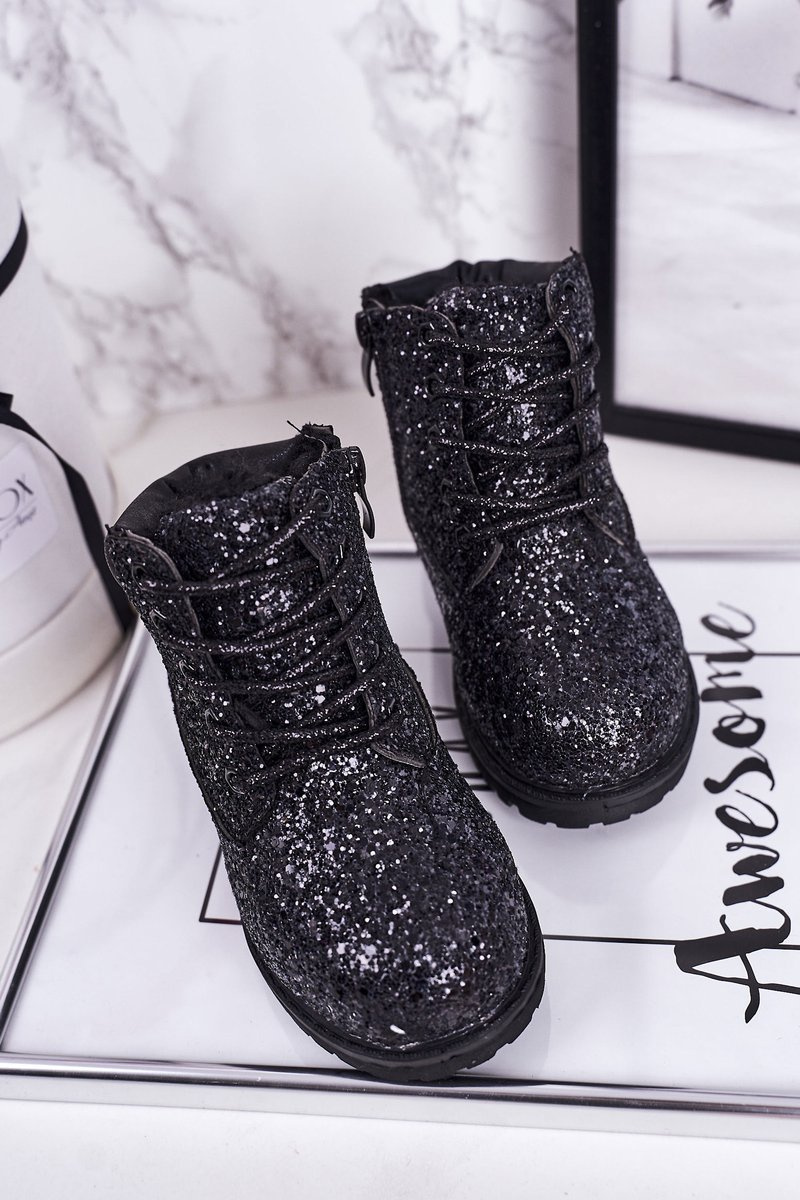 Dziecięce Brokatowe Ocieplane Botki Traperki Czarne Mermaid