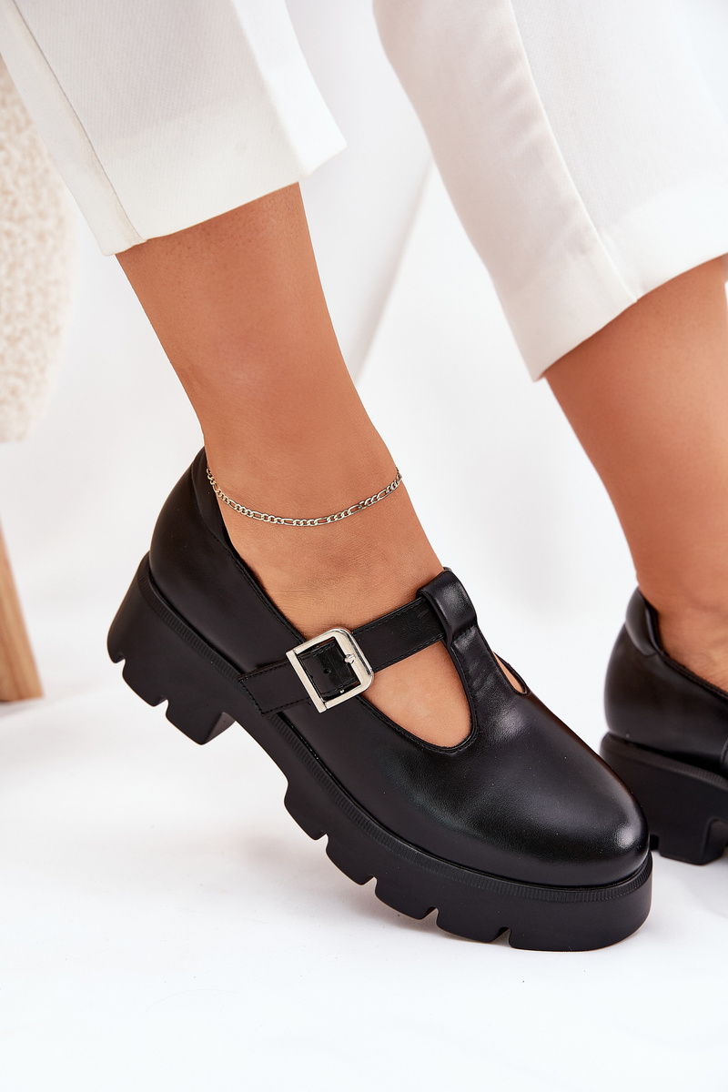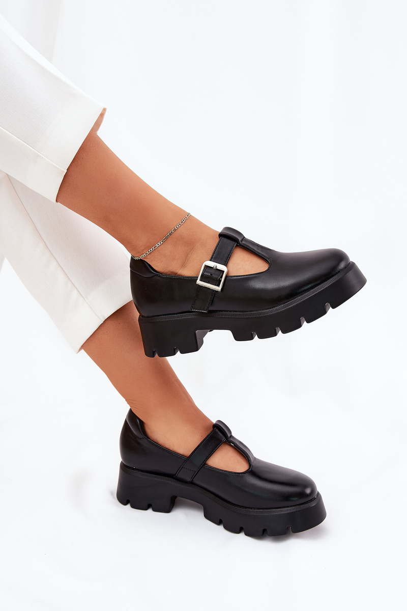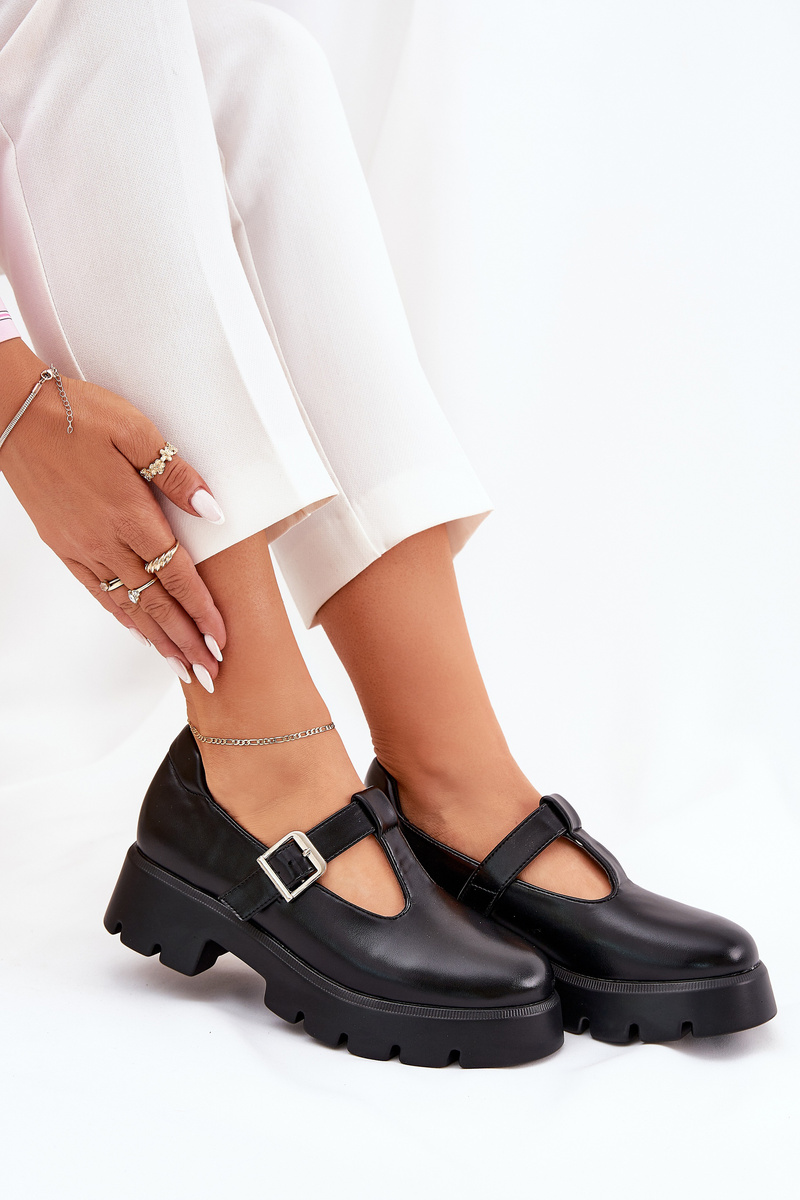 Eko Skórzane Półbuty Na Platformie I Płaskim Obcasie Z Klamrą Czarne Venda