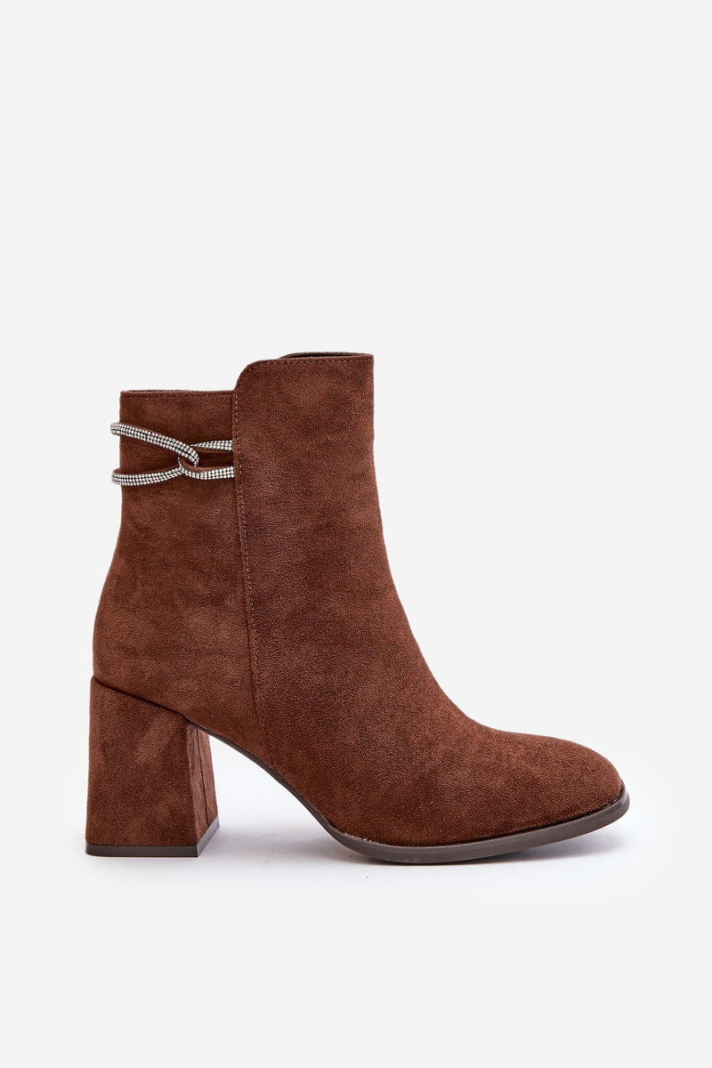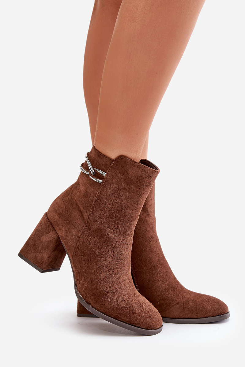 Eko Zamszowe Botki Na Słupku Ocieplane Damskie Brązowe Saivia