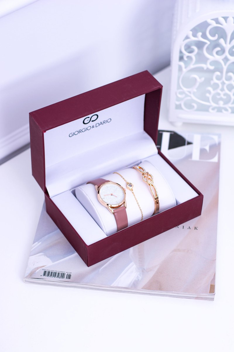 Giorgio Dario Zestaw Damski Zegarek Pudrowy Róż Z Brokatem Dwie Bransoletki