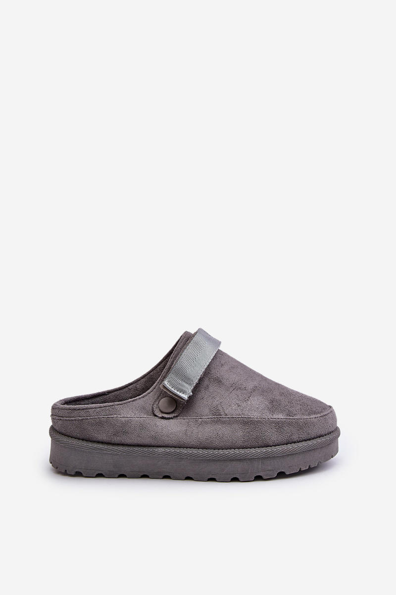 Klasyczne klapki o modnym fasonie pasują do wielu stylizacji! Idealne dla każdej kobiety ceniącej sobie komfort i wygodę na co dzień. Świetnie sprawdzą się w cieplejsze dni. Wykonane z eko zamszu. Osadzone na platformie. Noski zakryte, zaokrąglone. Środek ocieplony futerkiem. Dodatkowo model ten posiada ruchomy paseczek zapinany na rzep. Modny fason, który powinnaś mieć w swojej szafie!