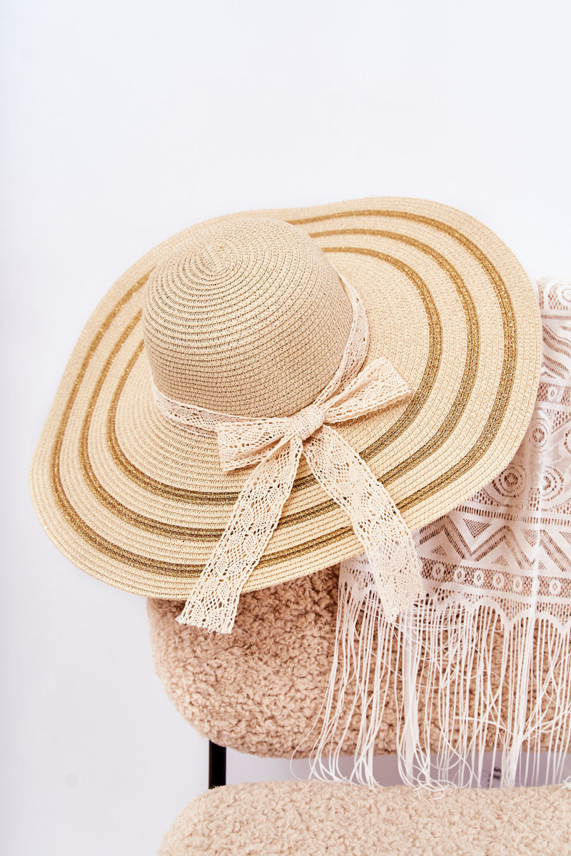 Odpowiednie nakrycie głowy podczas upalnych dni to podstawa! Pamiętaj o tym! Kapelusze świetnie sprawdzą się podczas wakacji czy urlopu, gdy słońce doskwiera przez długi czas. Właśnie takie nakrycie głowy powinno znaleźć się w Twojej szafie! Damski kapelusz z ozdobnym paskiem. Ozdobny pasek posiada kokardę. Produkt wykonany w 94 % z papieru i w 6 % z włókna metalizowanego. Posiada sznureczek umożliwiający regulację i dopasowanie do obwodu głowy. Rondo kapelusza posiada złote paski. Kapelusz świetnie sprawdza się w upalne dni! Koniecznie sprawdź całą naszą kolekcję kapeluszy!