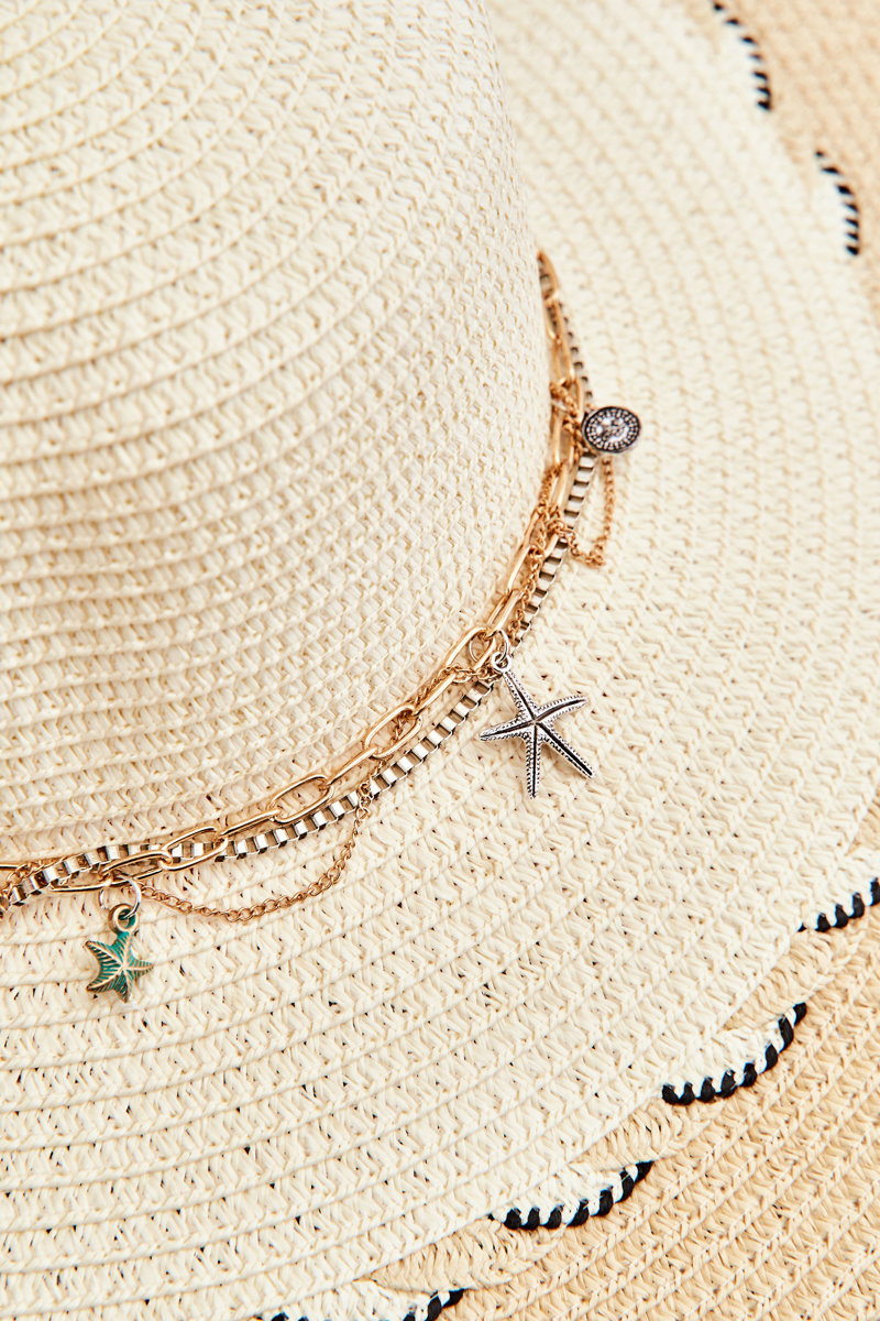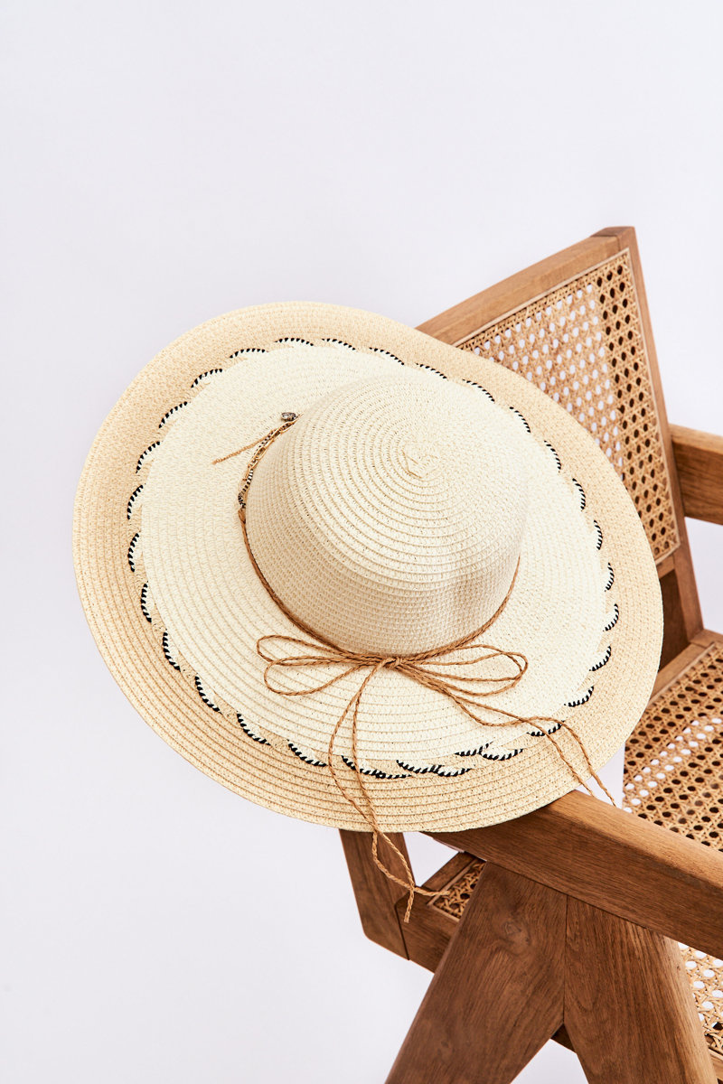 Odpowiednie nakrycie głowy podczas upalnych dni to podstawa! Pamiętaj o tym! Kapelusze świetnie sprawdzą się podczas wakacji czy urlopu, gdy słońce doskwiera przez długi czas. Właśnie takie nakrycie głowy powinno znaleźć się w Twojej szafie! Wyjątkowy kapelusz damski został wykonany w 100% z papieru. Na rondzie znajdują się ozdobne wzory. Na zdobinie został przyklejony sznurek z różnymi zawieszkami.