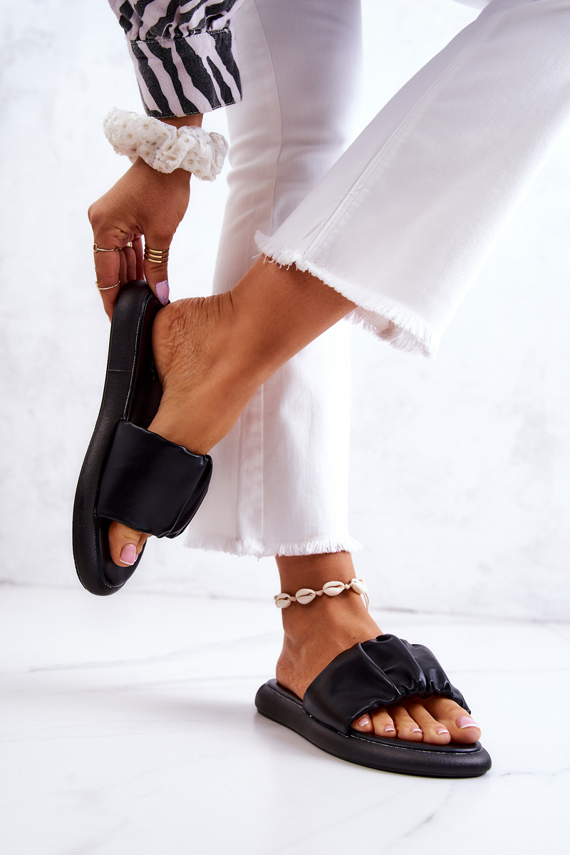 Klasyczne klapki o modnym fasonie pasują do wielu stylizacji! Idealne dla każdej kobiety ceniącej sobie komfort i wygodę na co dzień. Wykonane z marszczonej eko skóry. Miękka wkładka jest także wykonana z eko skóry. Platforma oraz podeszwa wykonane z tworzywa sztucznego. Model wsuwany. Świetnie sprawdzą się w wielu stylizacjach. Koniecznie sprawdź także pozostałe klapki damskie !