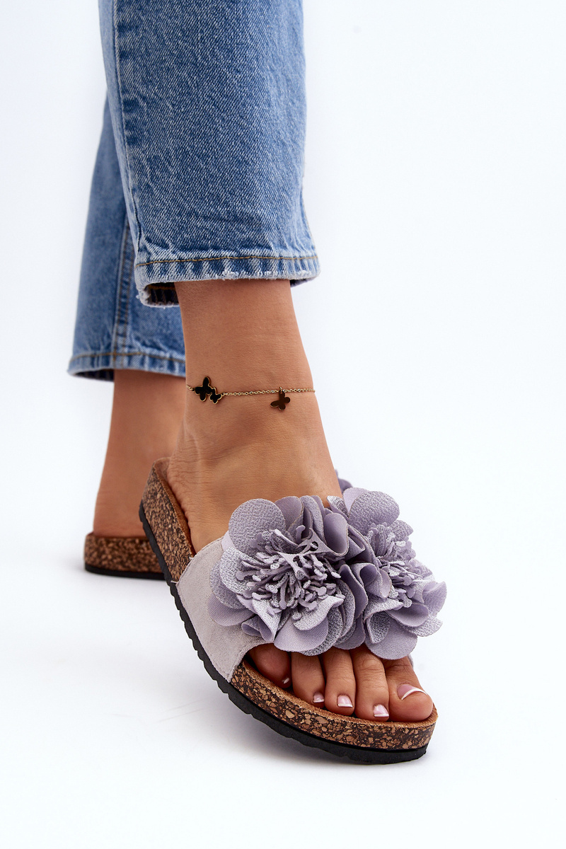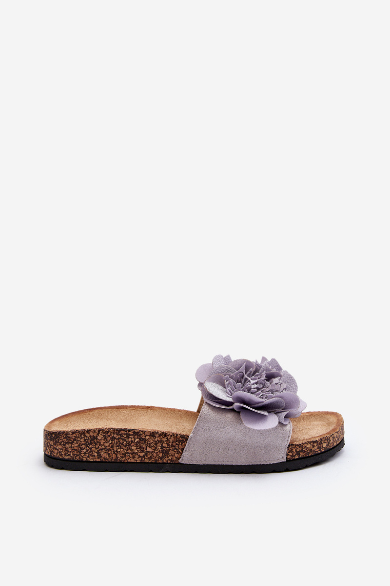 Klasyczne klapki o modnym fasonie pasują do wielu stylizacji! Idealne dla każdej kobiety ceniącej sobie komfort i wygodę na co dzień. Idealne na cieplejsze dni. Model ten osadzony jest na korkowej platformie. Z przodu zdobienie w postaci kwiatów. Model ten posiada lekko profilowaną wkładkę, wykonaną z eko zamszu.