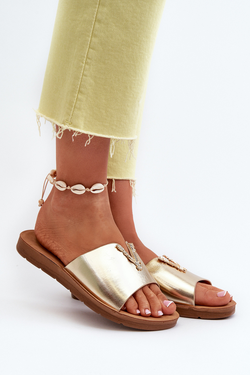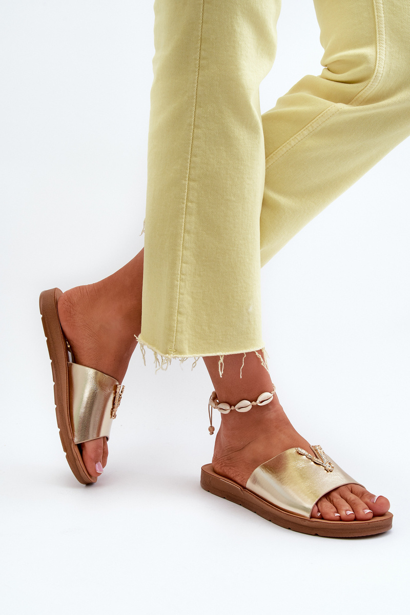 Klapki Damskie Płaska Podeszwa Ozdoba Eko Skóra Złote Makia