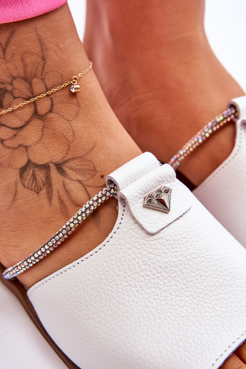 Klasyczne klapki o modnym fasonie pasują do wielu stylizacji! Idealne dla każdej kobiety ceniącej sobie komfort i wygodę na co dzień. Świetnie sprawdzą się w cieplejsze dni. Wykonane z naturalnej skóry. Klapki posiadają dodatkowo ozdobny pasek z dżetami. Model ten jest klasycznie wsuwany. Klapki posiadają skórzaną, miękką wkładkę i są osadzone na płaskim obcasie. Nosek jest odkryty, kwadratowy.
