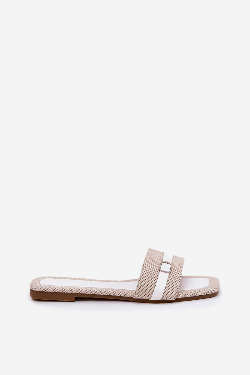 Klapki Damskie Płaskie Materiałowe Z Paskiem I Sprzączką Beżowo-Białe Zilina