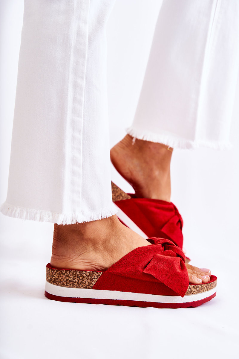Klasyczne klapki o modnym fasonie pasują do wielu stylizacji! Idealne dla każdej kobiety ceniącej sobie komfort i wygodę na co dzień. Świetnie sprawdzą się w cieplejsze dni. Wykonane z eko zamszu. Model klasyczny, wsuwany. Buty osadzone na korkowej platformie. Nosek odkryty, zaokrąglony. Modna kokarda ozdabia przód obuwia. Koniecznie powinnaś mieć ten model w swojej szafie!