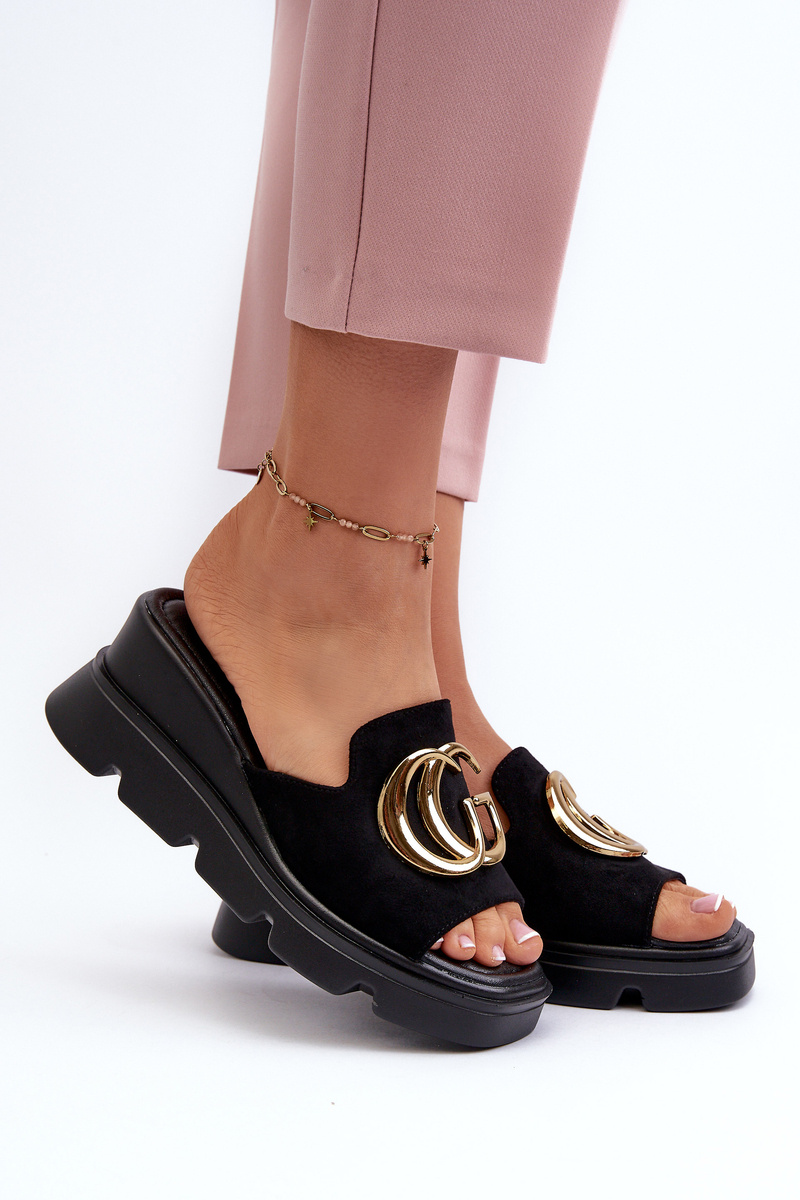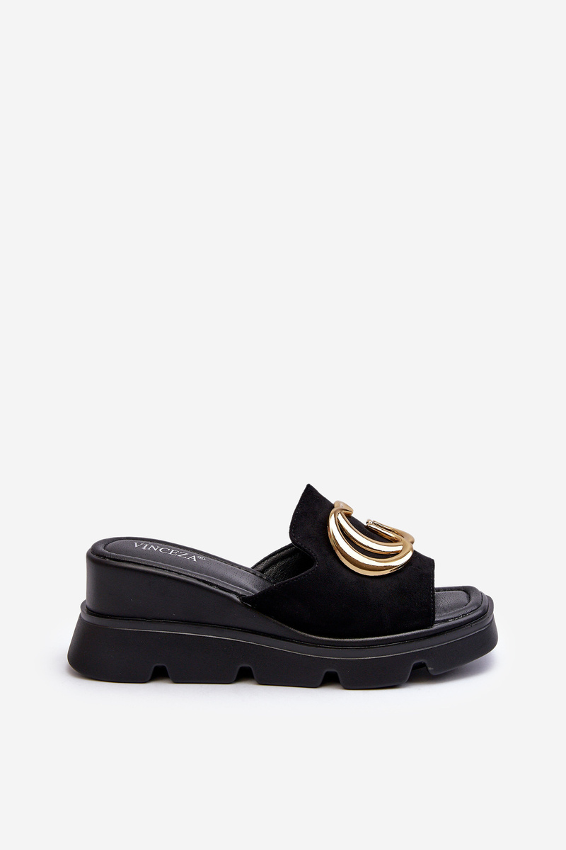 Klapki Damskie Platforma Koturn Eko Zamsz Złota Ozdoba Vinceza 58295 Czarne
