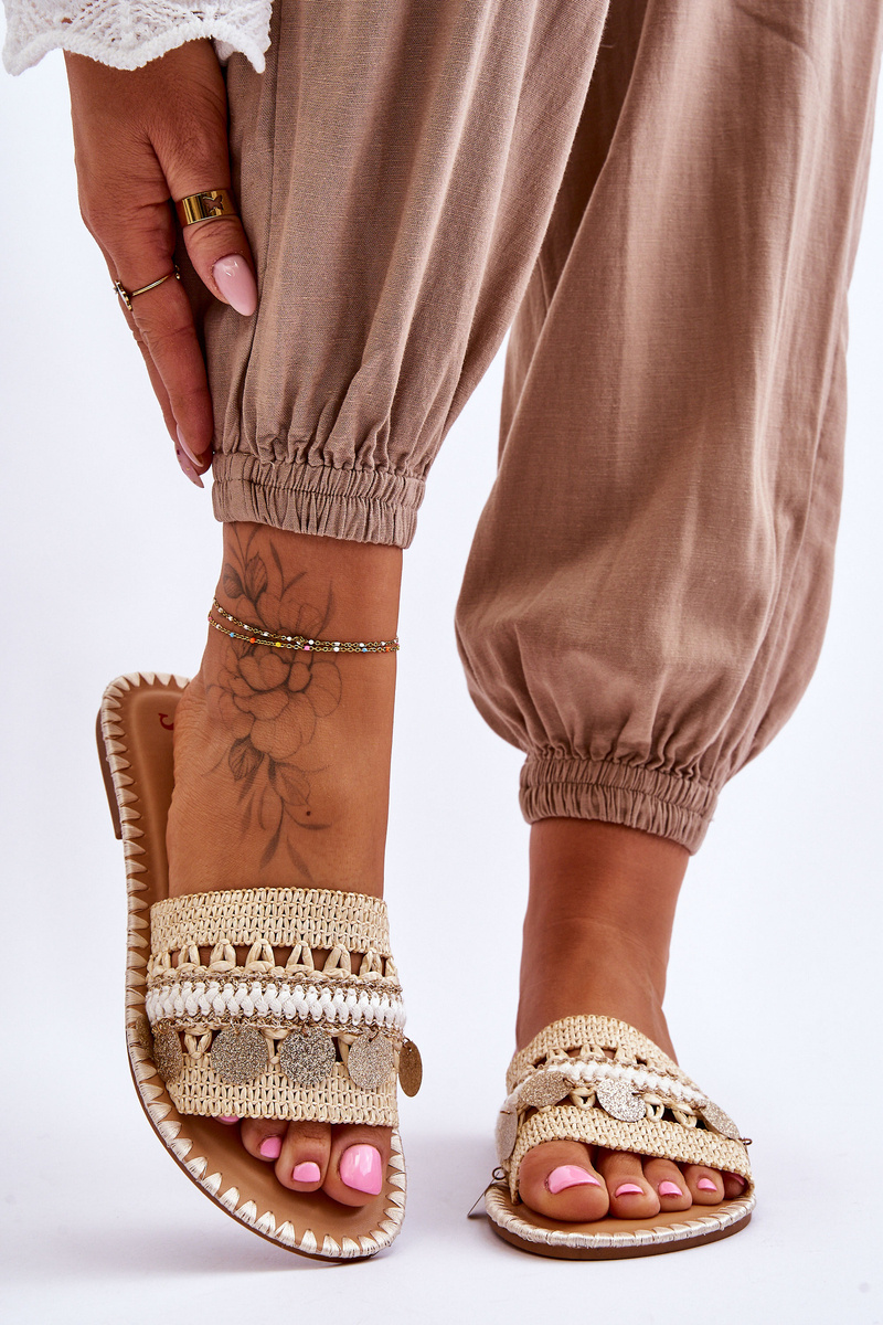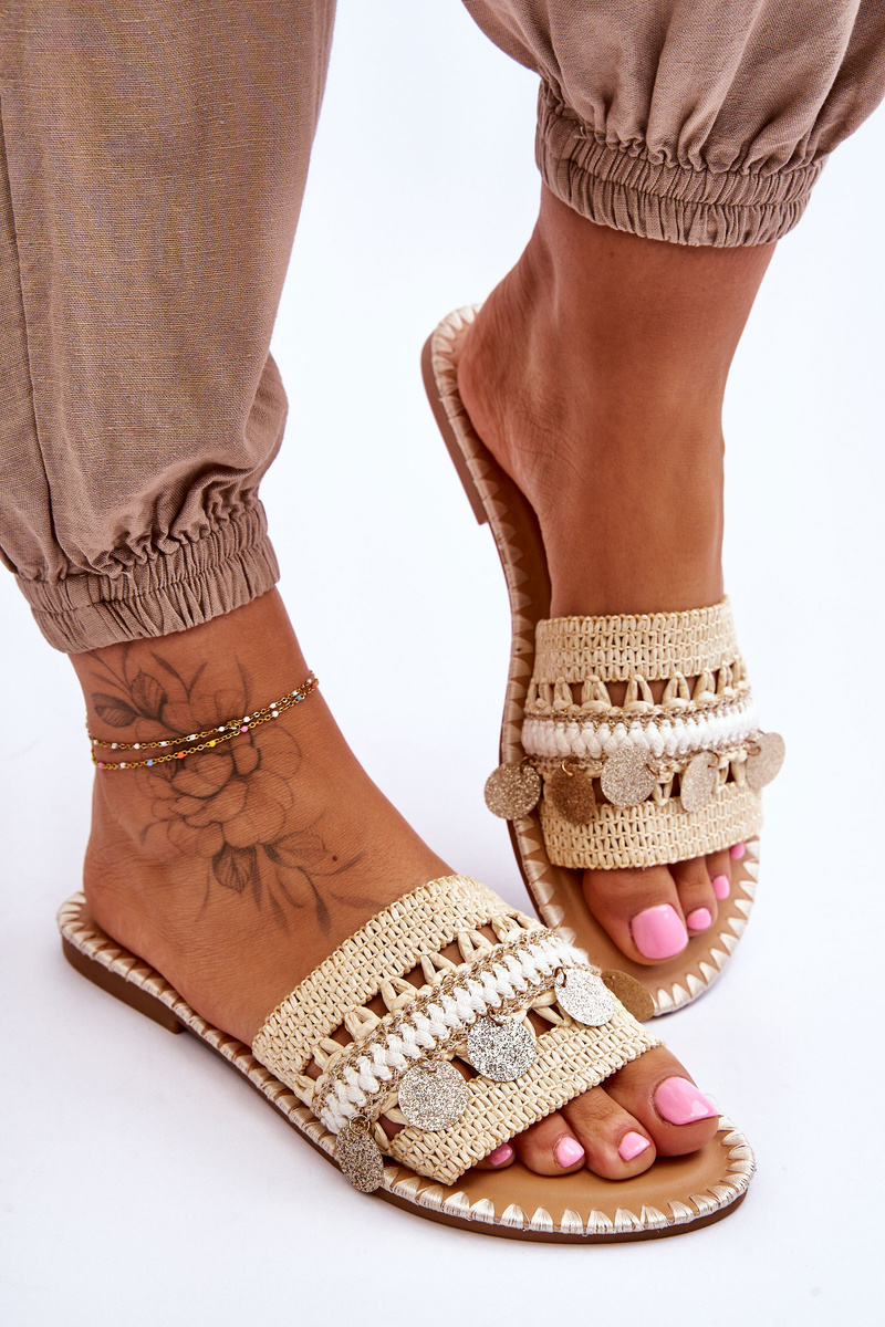 Klapki Damskie Plecione Zdobione Beżowe Millano
