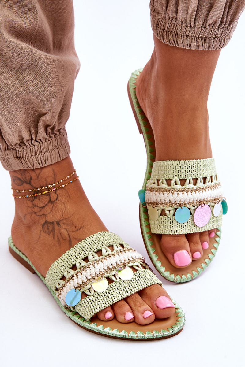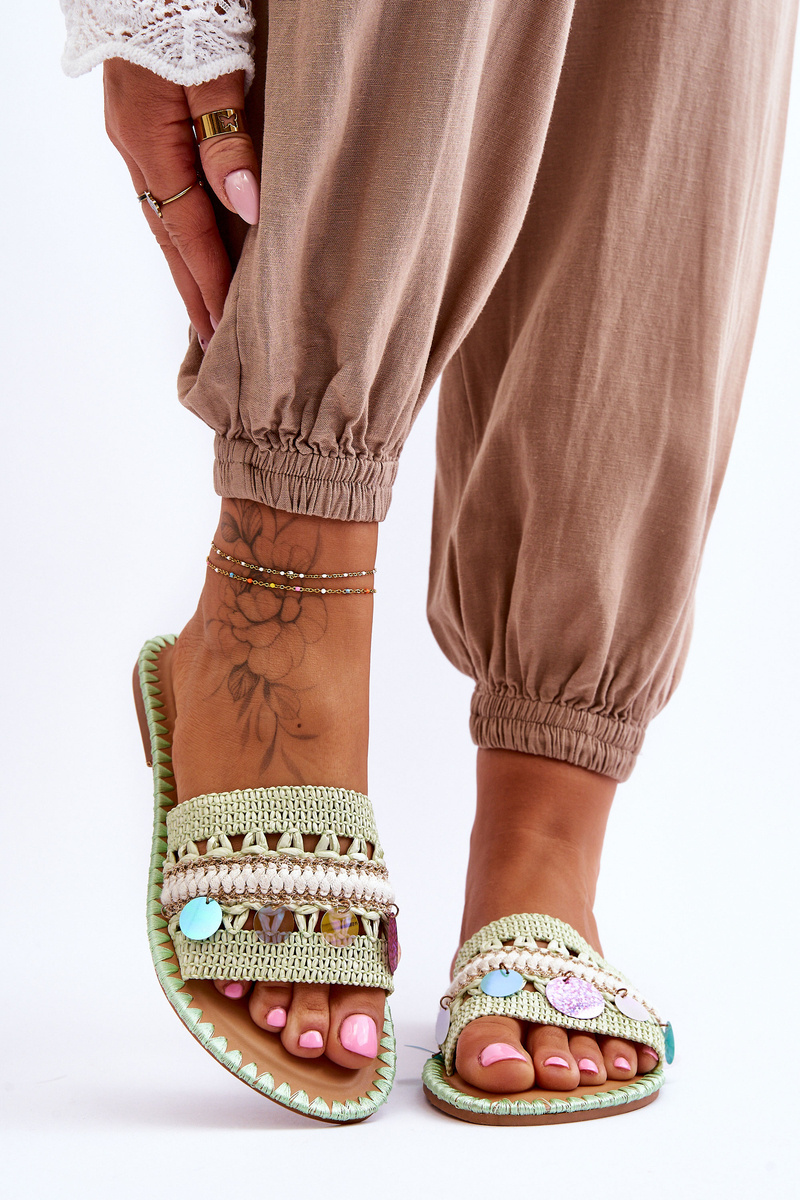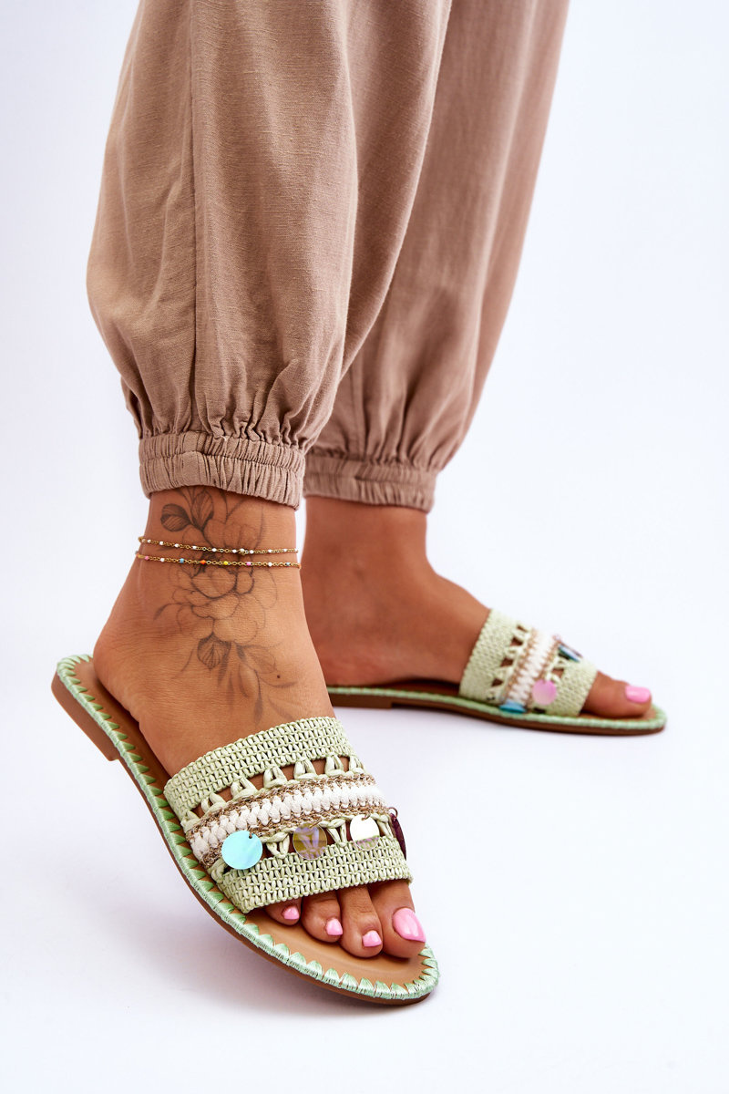 Klapki Damskie Plecione Zdobione Zielone Millano