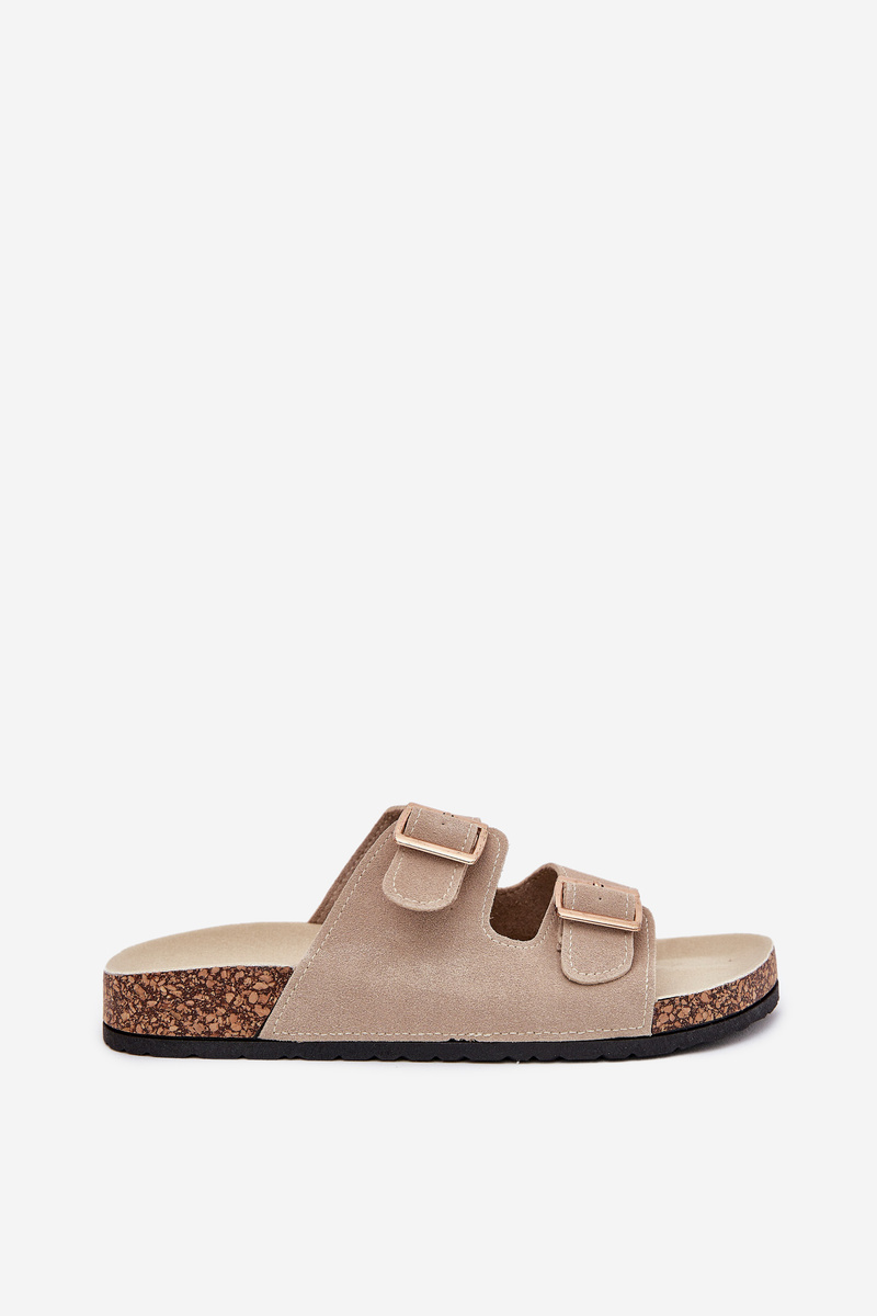 Klasyczne klapki o modnym fasonie pasują do wielu stylizacji! Idealne dla każdej kobiety ceniącej sobie komfort i wygodę na co dzień. Idealne na cieplejsze dni. Wykonane z eko zamszu. Osadzone na korkowej platformie. Dwie złote klamry z regulowanymi paskami, zapewniają doskonałe dopasowanie do tęgości stopy. Lekko profilowana wkładka. Modny fason, który doskonale uzupełni codzienne stylizacje!