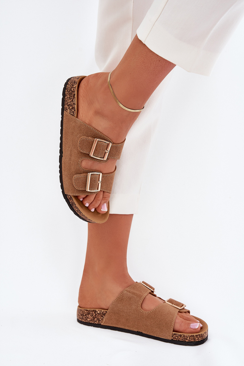 Klasyczne klapki o modnym fasonie pasują do wielu stylizacji! Idealne dla każdej kobiety ceniącej sobie komfort i wygodę na co dzień. Idealne na cieplejsze dni. Wykonane z eko zamszu. Osadzone na korkowej platformie. Dwie złote klamry z regulowanymi paskami, zapewniają doskonałe dopasowanie do tęgości stopy. Lekko profilowana wkładka. Modny fason, który doskonale uzupełni codzienne stylizacje!