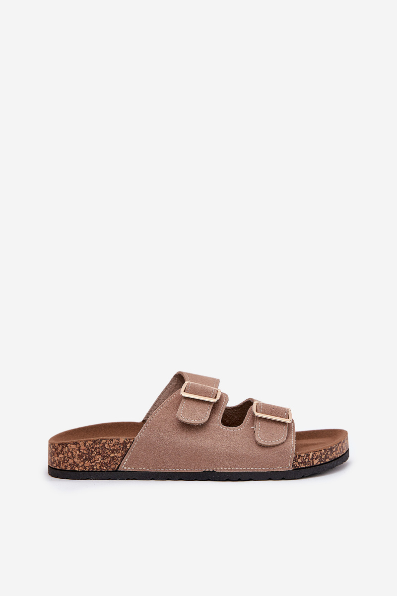 Klasyczne klapki o modnym fasonie pasują do wielu stylizacji! Idealne dla każdej kobiety ceniącej sobie komfort i wygodę na co dzień. Idealne na cieplejsze dni. Wykonane z eko zamszu. Osadzone na korkowej platformie. Dwie złote klamry z regulowanymi paskami, zapewniają doskonałe dopasowanie do tęgości stopy. Lekko profilowana wkładka. Modny fason, który doskonale uzupełni codzienne stylizacje!