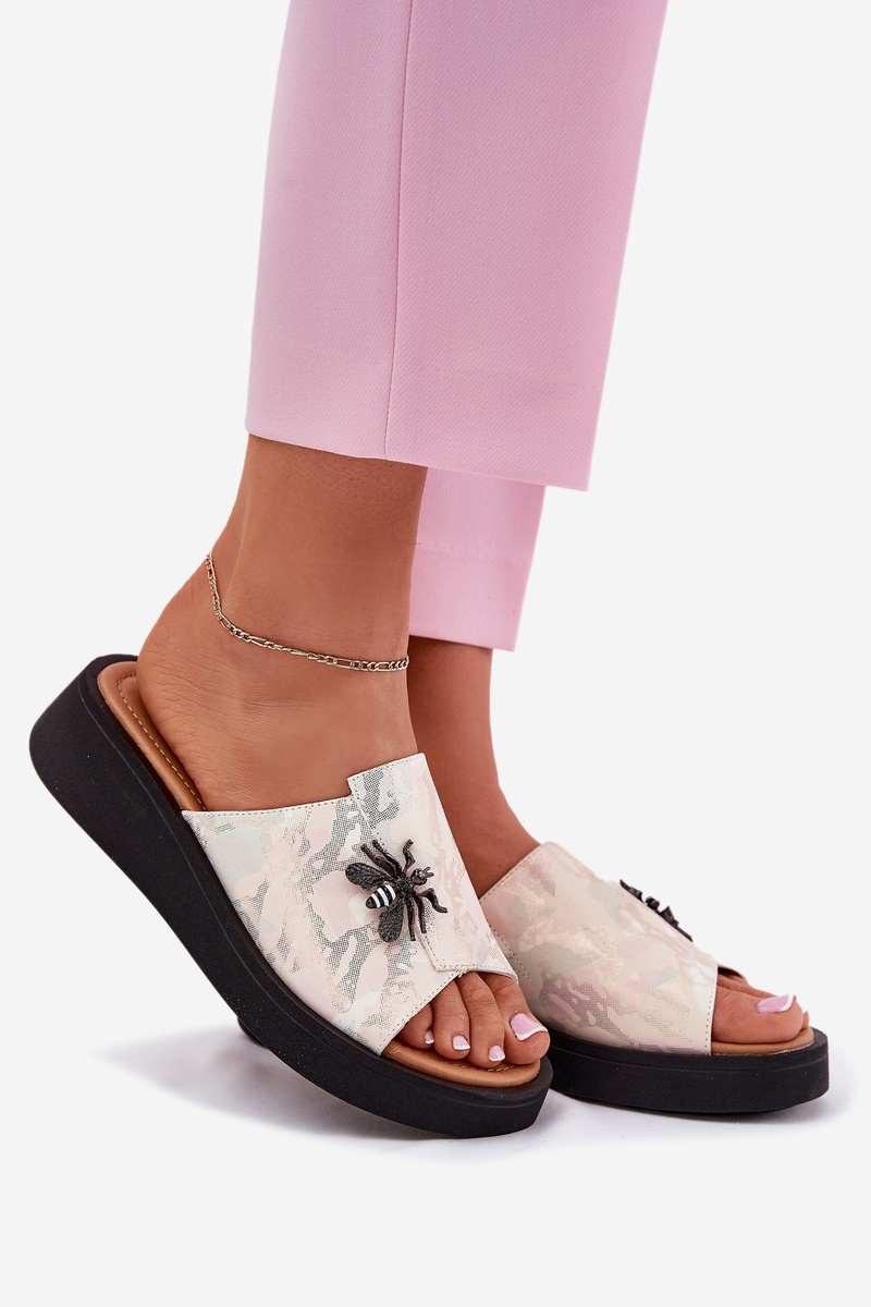 Klapki Damskie Skóra Naturalna Broszka Beżowe Vinceza 66752