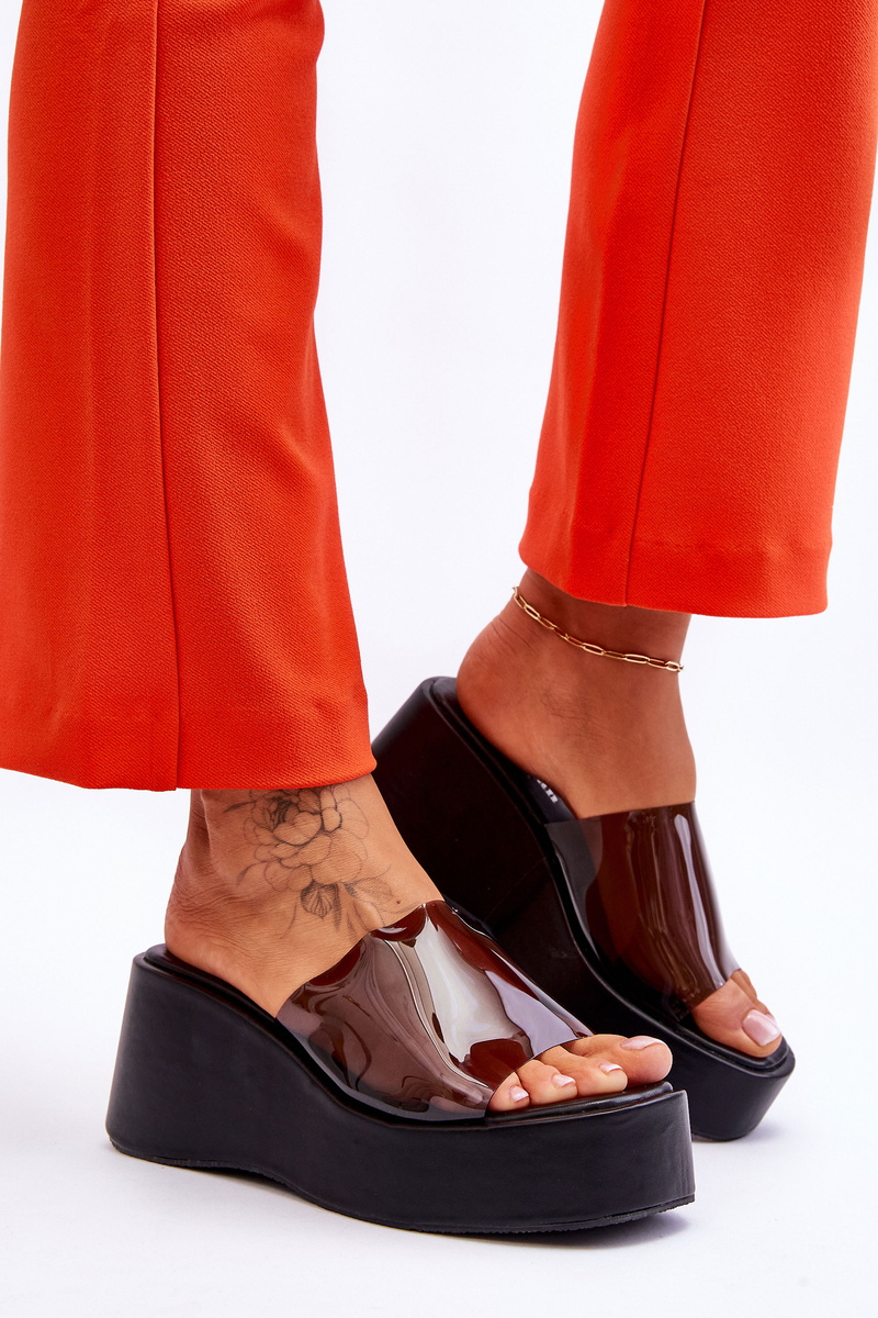 Klasyczne klapki o modnym fasonie pasują do wielu stylizacji! Idealne dla każdej kobiety ceniącej sobie komfort i wygodę na co dzień. Świetnie sprawdzą się w cieplejsze dni. Wykonane z wierzchu z transparentnego tworzywa sztucznego. Wkładka wykonana z eko skóry zapewni komfort podczas użytkowania. Osadzone na masywnej platformie i koturnie. Model klasyczny, wsuwany. Idealne obuwie na lato!
