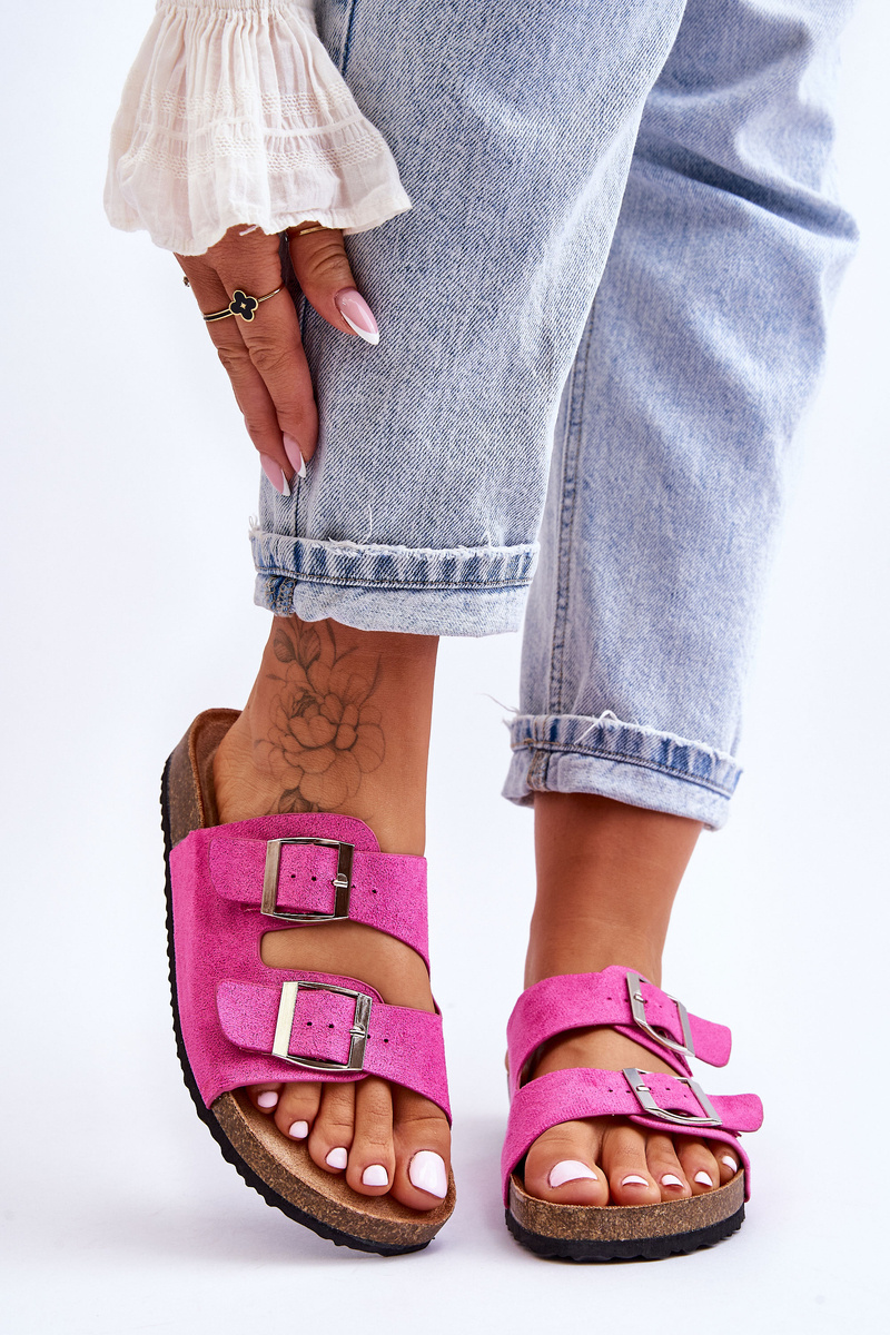 Klasyczne klapki o modnym fasonie pasują do wielu stylizacji! Idealne dla każdej kobiety ceniącej sobie komfort i wygodę na co dzień. Idealne na cieplejsze dni. Wykonane z wierzchu z miłego w dotyku eko zamszu. Posiadają regulowane paski z ozdobnymi klamrami. Model klasyczny, wsuwany. Klapki osadzono na korkowej platformie. Wkładka także została wykonana z eko zamszu i jest profilowana. Idealne obuwie na co dzień w sezonie letnim.