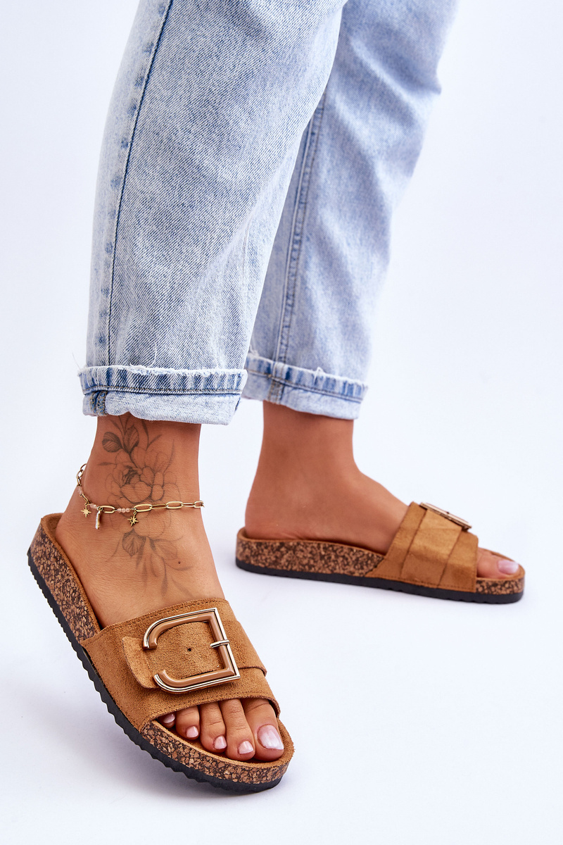 Klasyczne klapki o modnym fasonie pasują do wielu stylizacji! Idealne dla każdej kobiety ceniącej sobie komfort i wygodę na co dzień. Idealne na cieplejsze dni. Wykonane z wierzchu z eko zamszu z ozdobną klamrą. Model klasyczny, wsuwany. Klapki osadzono na korkowej platformie. Wkładka została wykonana także z eko zamszu. Idealne na cieplejsze dni. Koniecznie powinnaś je mieć!