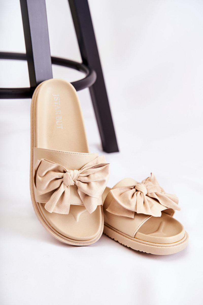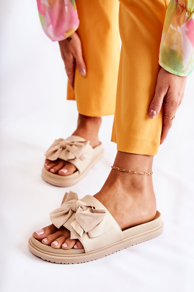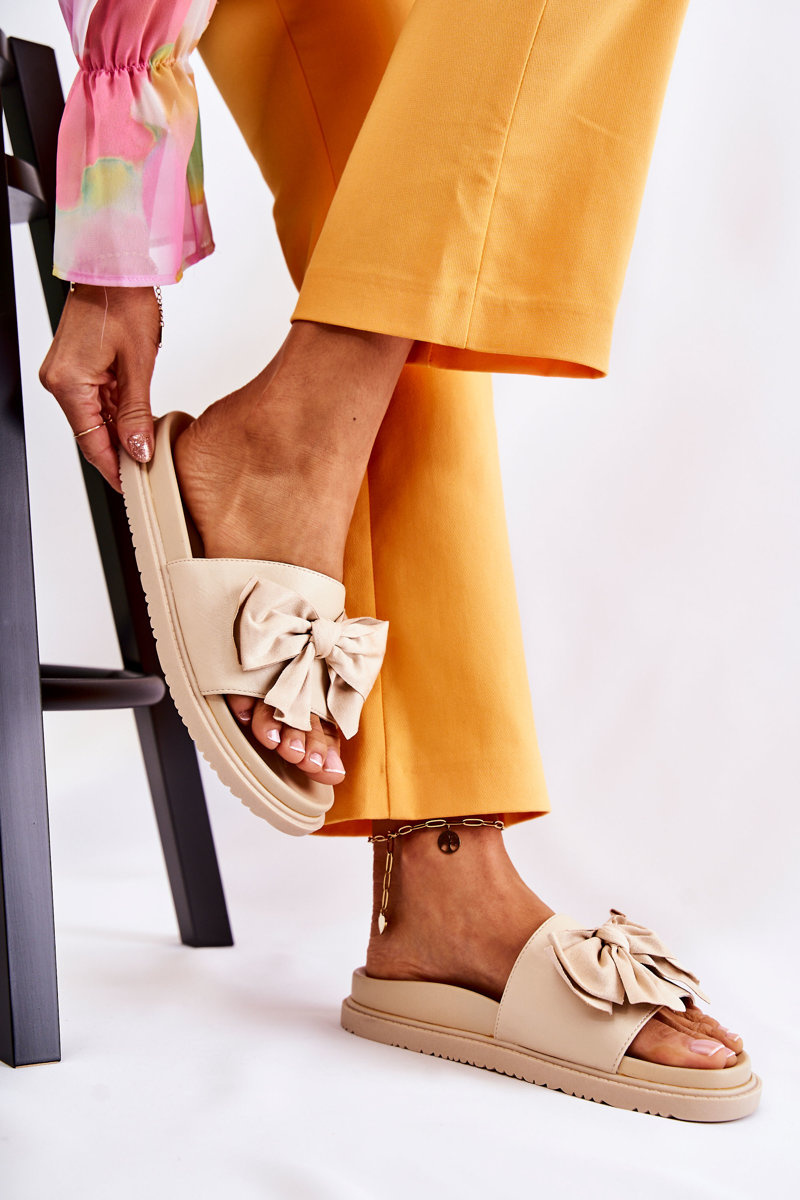 Klapki Klasyczne Damskie Skórzane Kokarda Beżowe Dessy