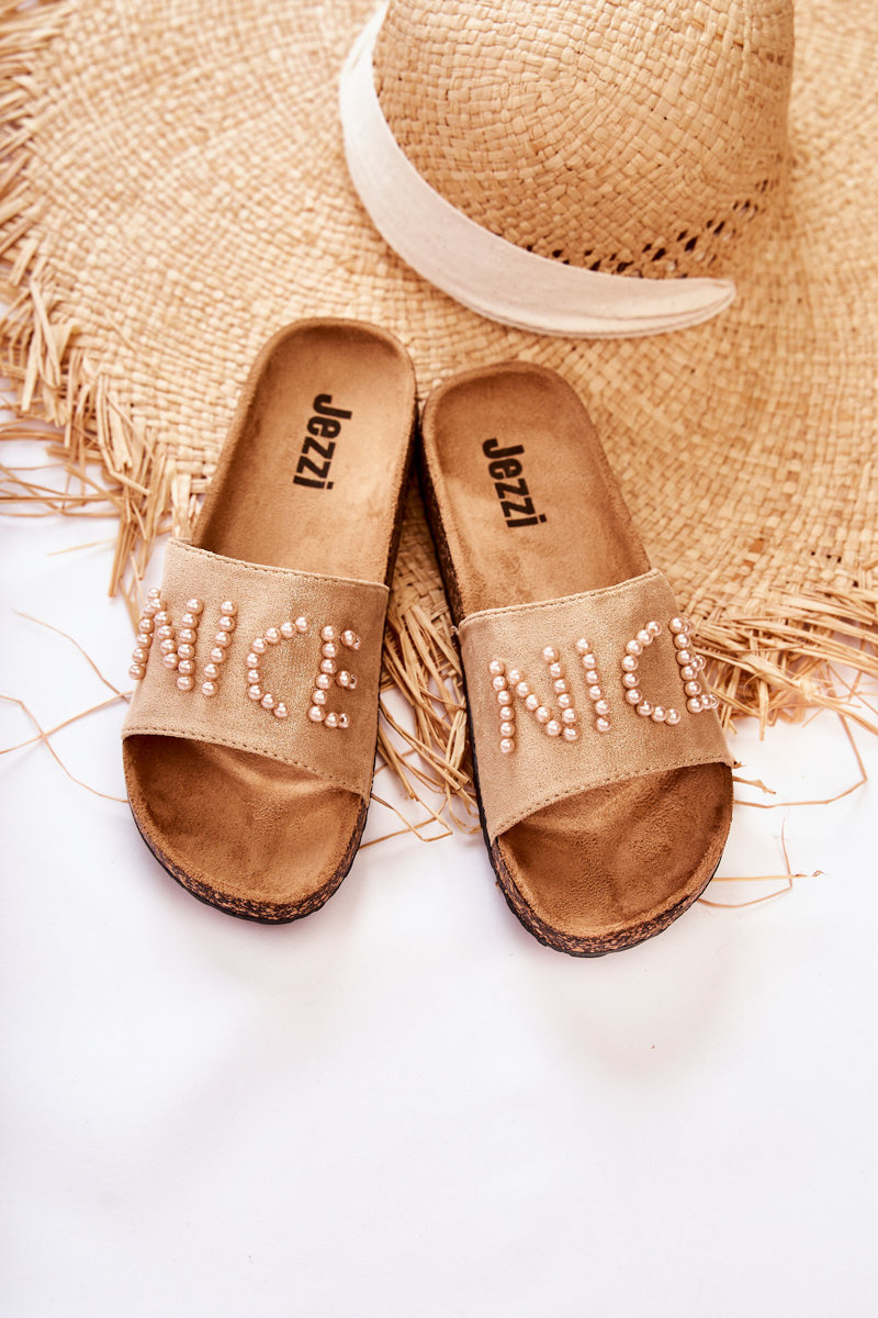 Klapki Klasyczne Zamsz Koraliki Napis Beżowe Vayana